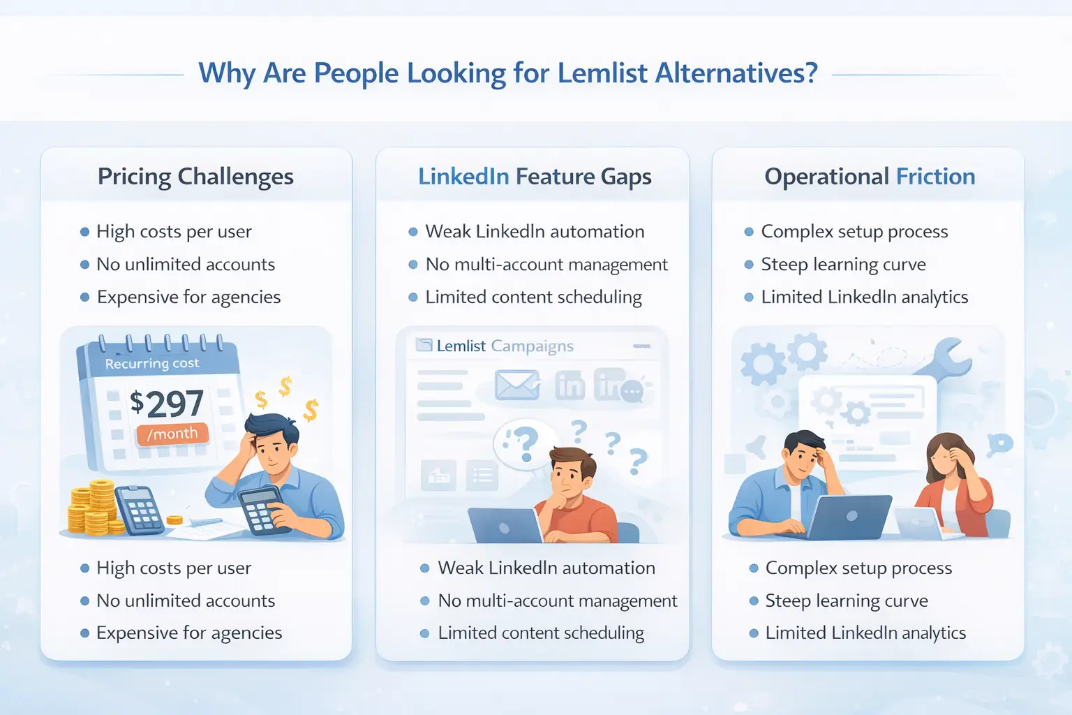 Thousands of B2B sales teams face this: Lemlist dominates email personalization but falls short on LinkedIn automation, multi-account management, and content scheduling.