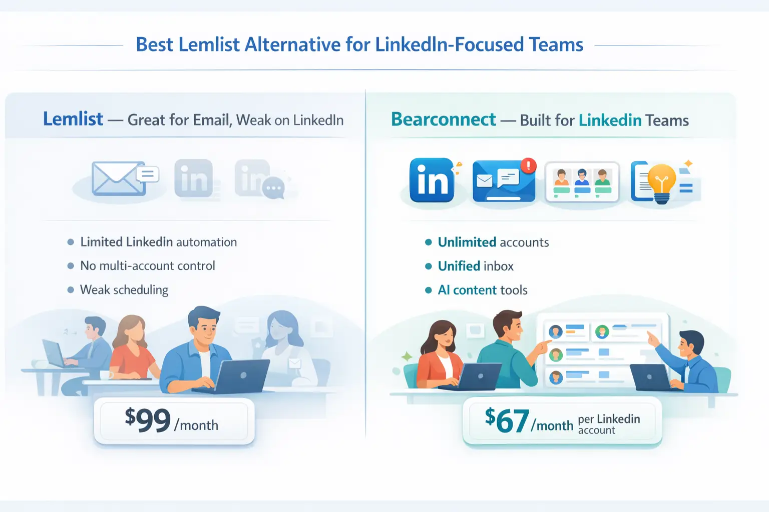 For LinkedIn-focused teams, Bearconnect is the best Lemlist alternative at $67/month per LinkedIn account (32% less than Lemlist's $99/month multichannel plan) with unlimited accounts, unified inbox, and AI-powered content.