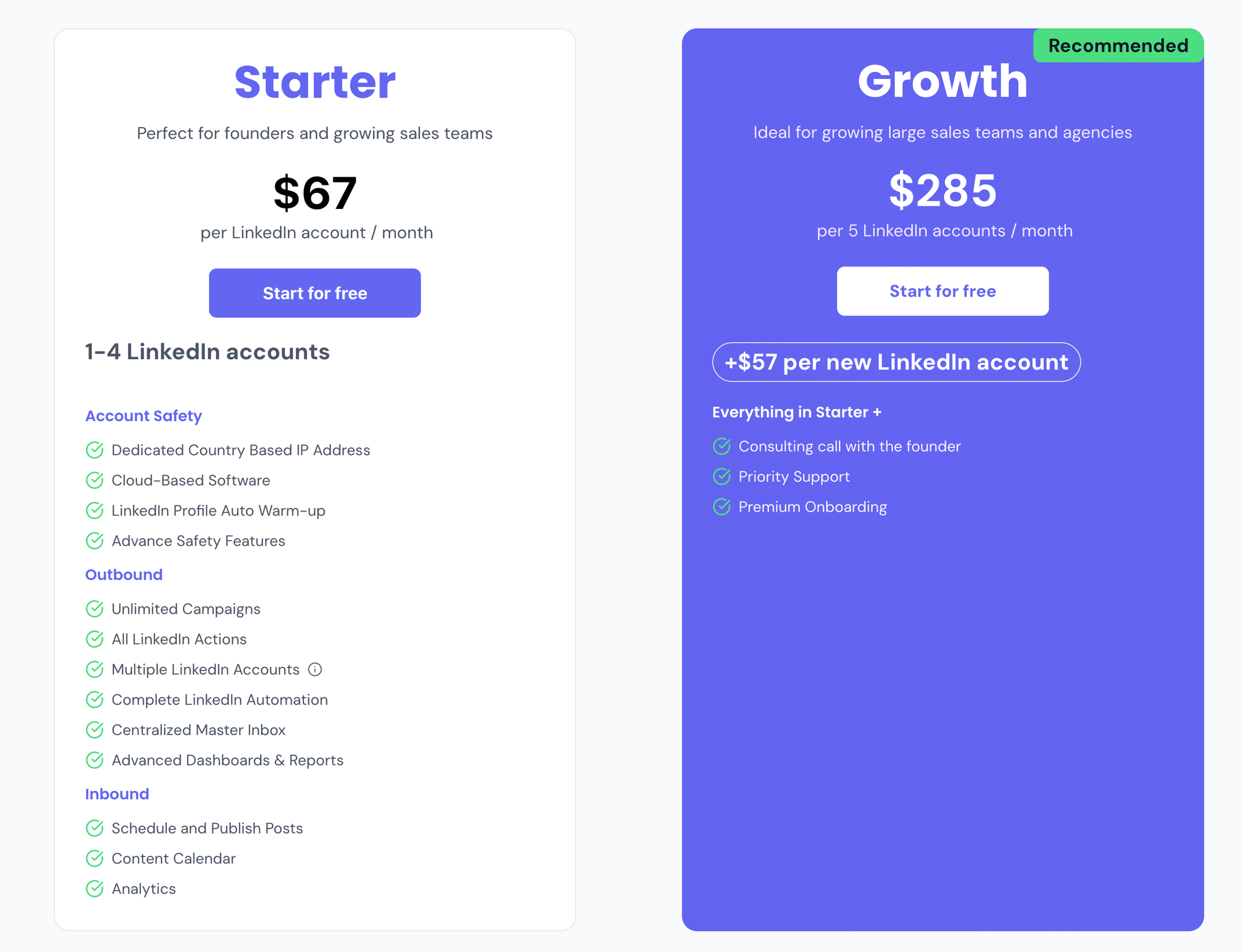- $67/month per LinkedIn account (standard pricing)