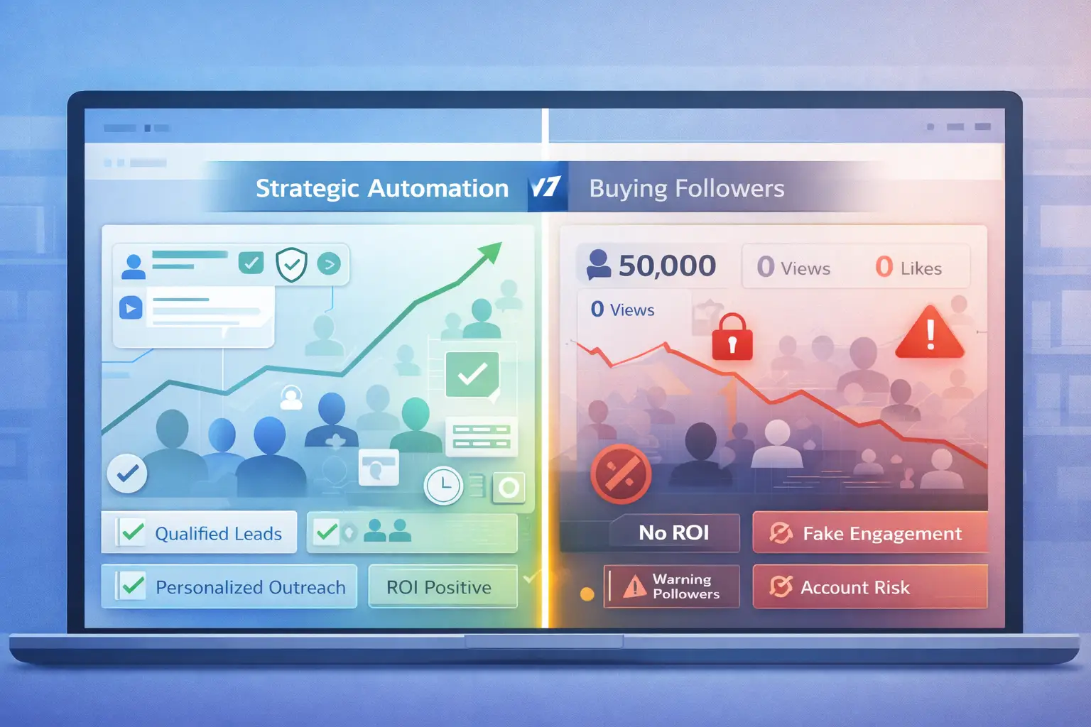 Automation generates real leads and qualified connections while purchased followers damage your credibility, trigger account restrictions, and provide zero business value.