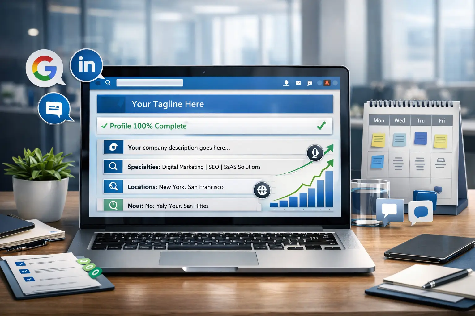 Your tagline appears directly under your company name. Make it benefit-focused, not generic.