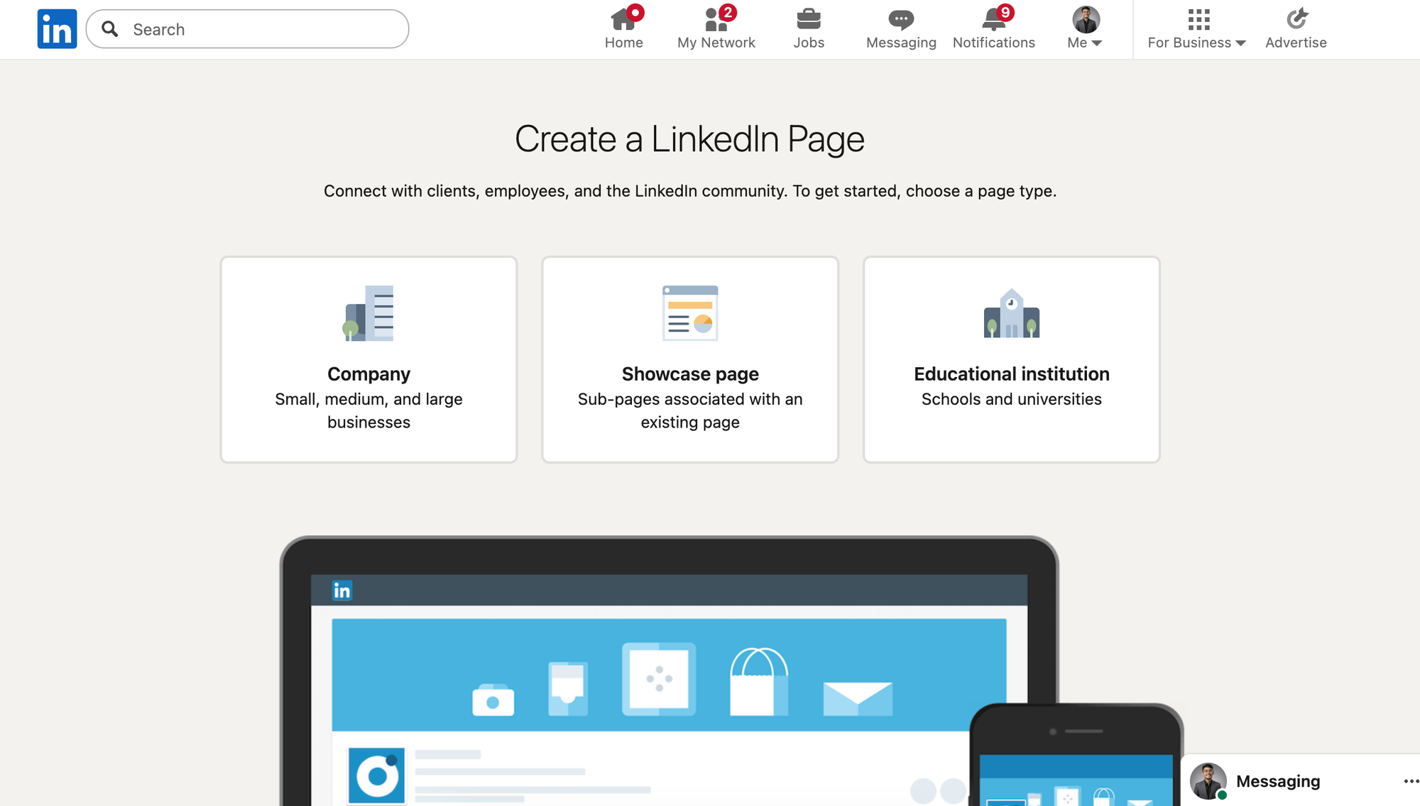 LinkedIn presents different options for the type of page you want to create.