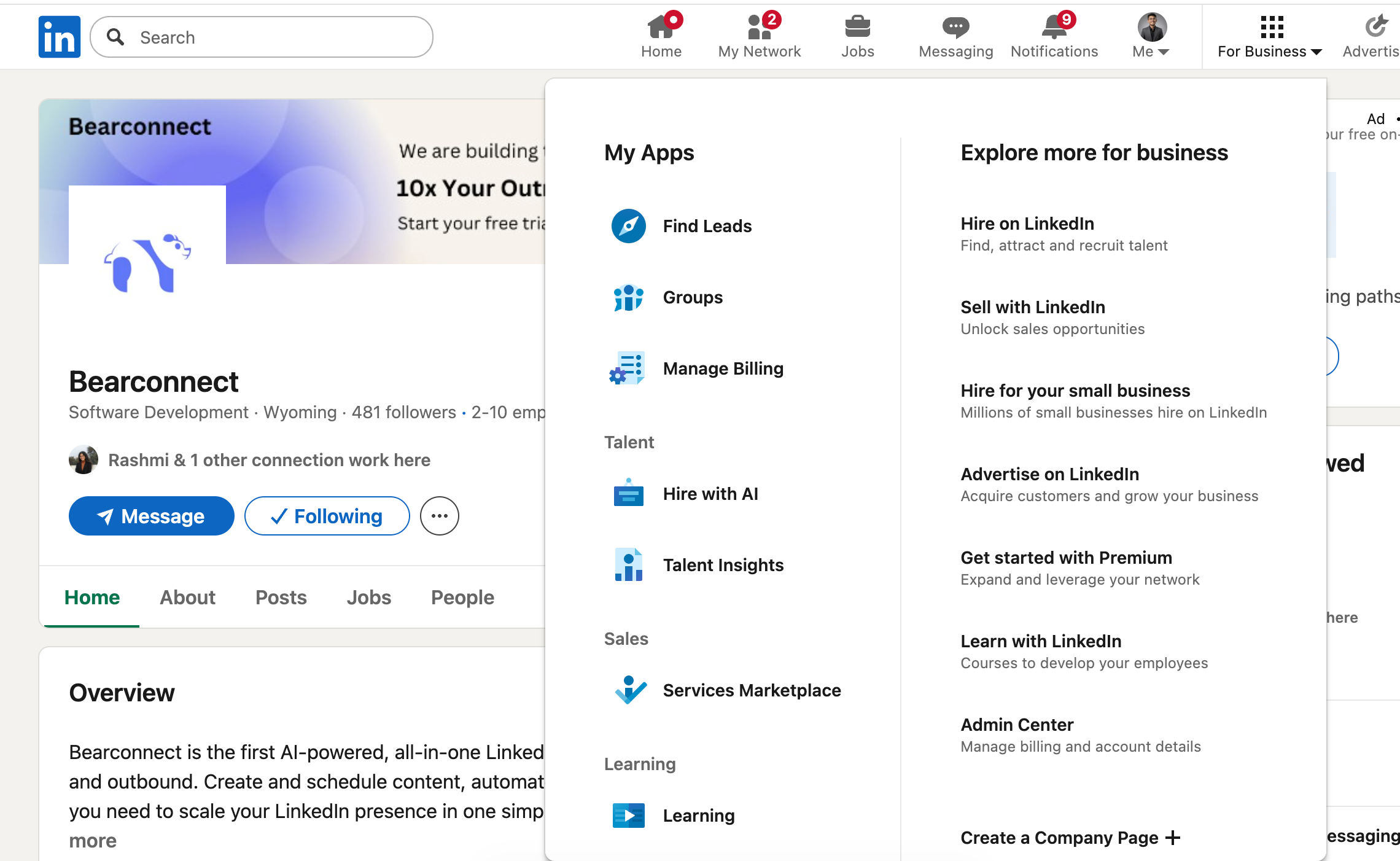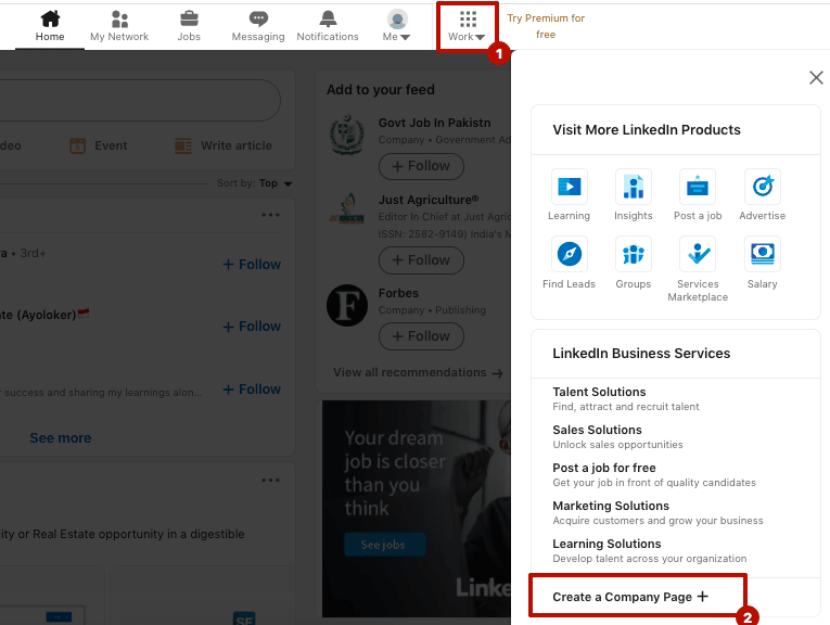 At the bottom of the menu, you'll see the option "Create a Company Page." Click on it.