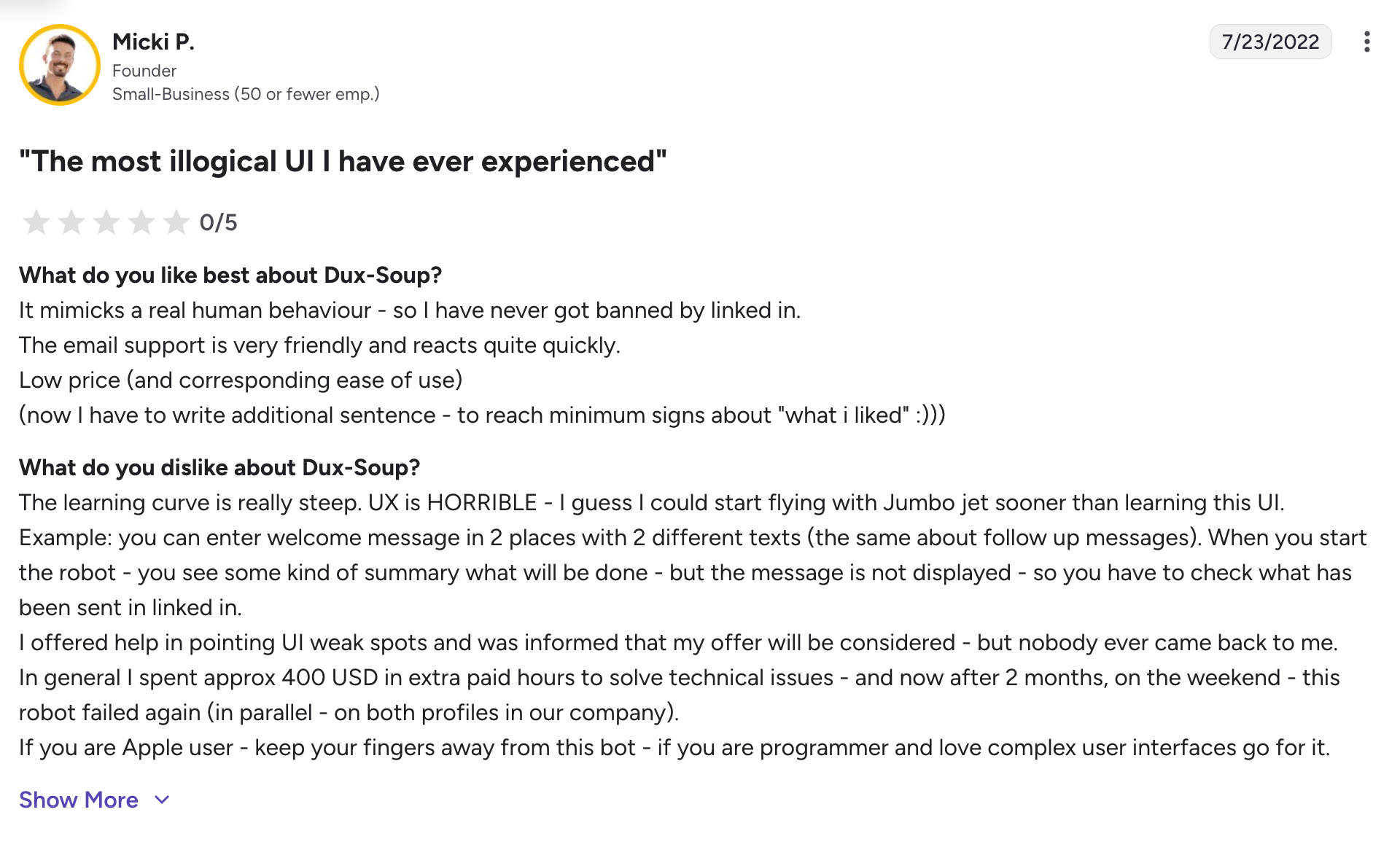 - "Unable to use Dux-Soup even after repeatedly trying to reach their support team.”