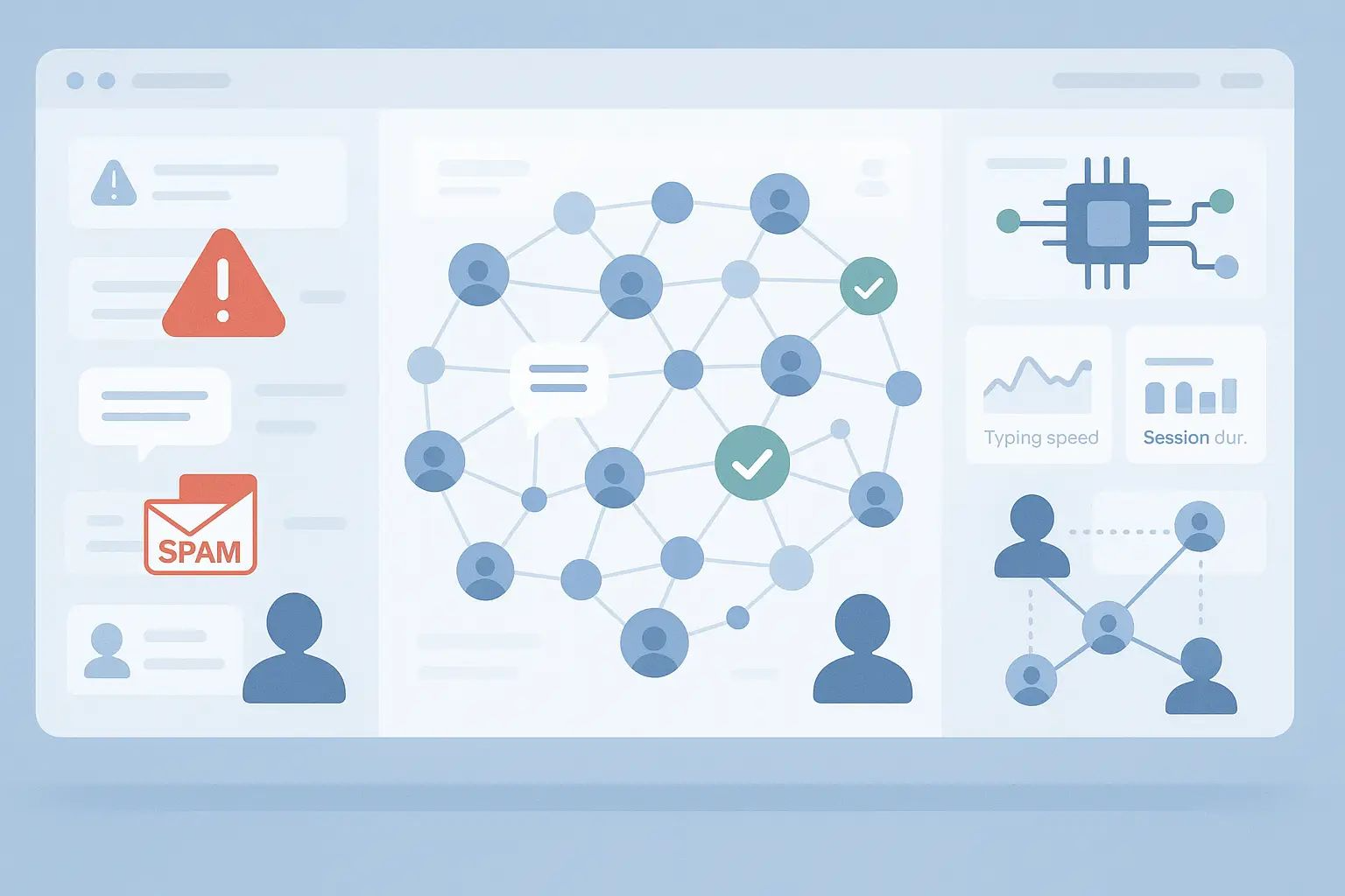 - Behavioral analysis tracks typing speed, click patterns, and session duration