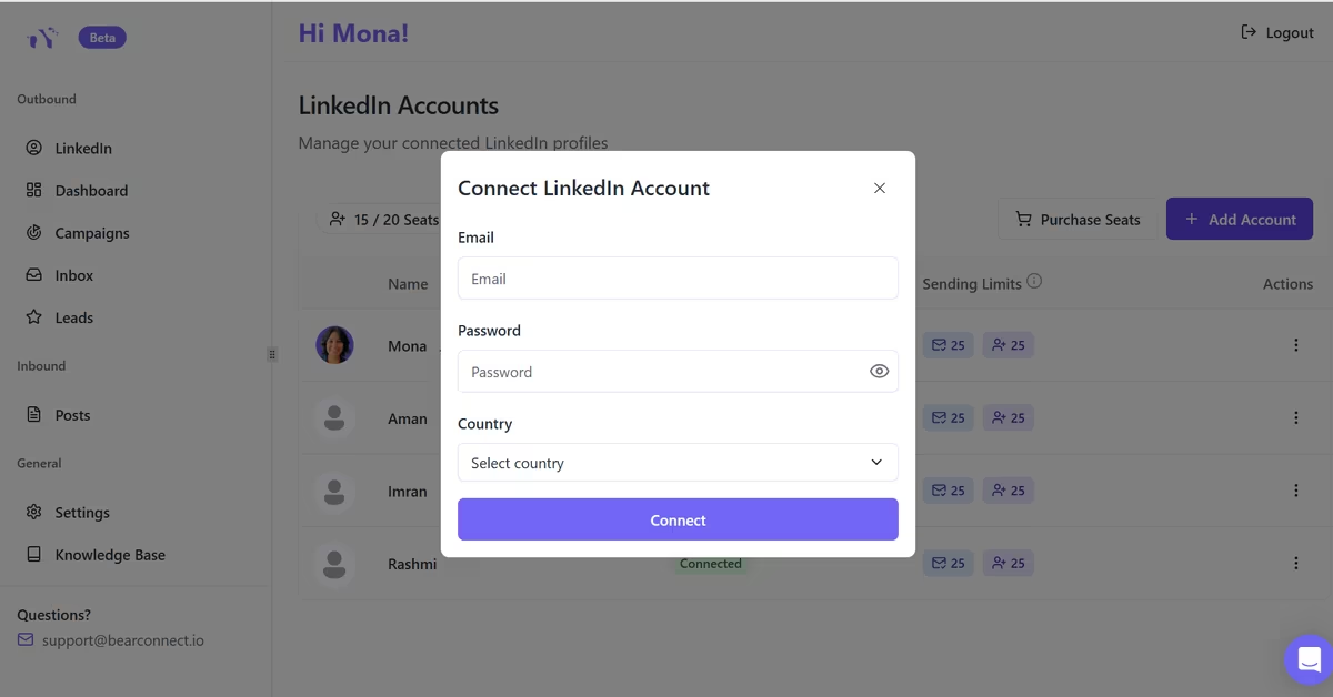 Explore Bearconnect's unified inbox feature for managing multiple LinkedIn accounts seamlessly.
