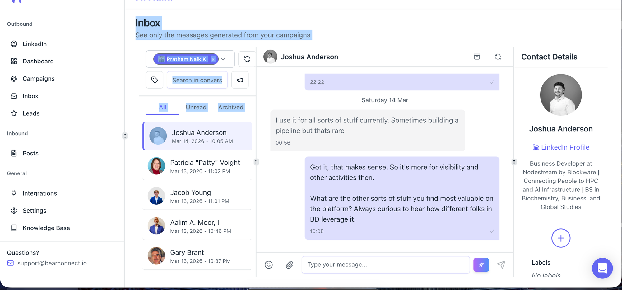 Bearconnect's unified inbox consolidates messages from all connected LinkedIn accounts into one thread view.