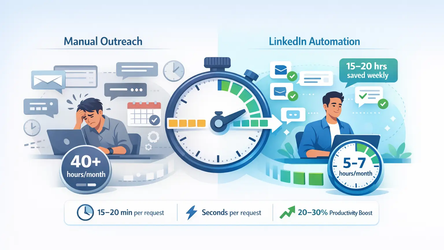 LinkedIn automation saves professionals 30-40 hours monthly by eliminating repetitive outreach tasks like sending connection requests, crafting follow-ups, and scheduling content.