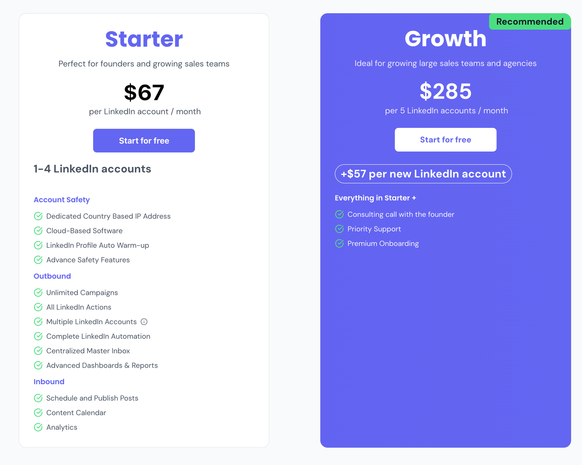 Pricing: $67/month per LinkedIn account. Connect 5 or more accounts and the price drops to $57/month per LinkedIn account. Competitors charge $150 to $500 per month for similar or fewer features.