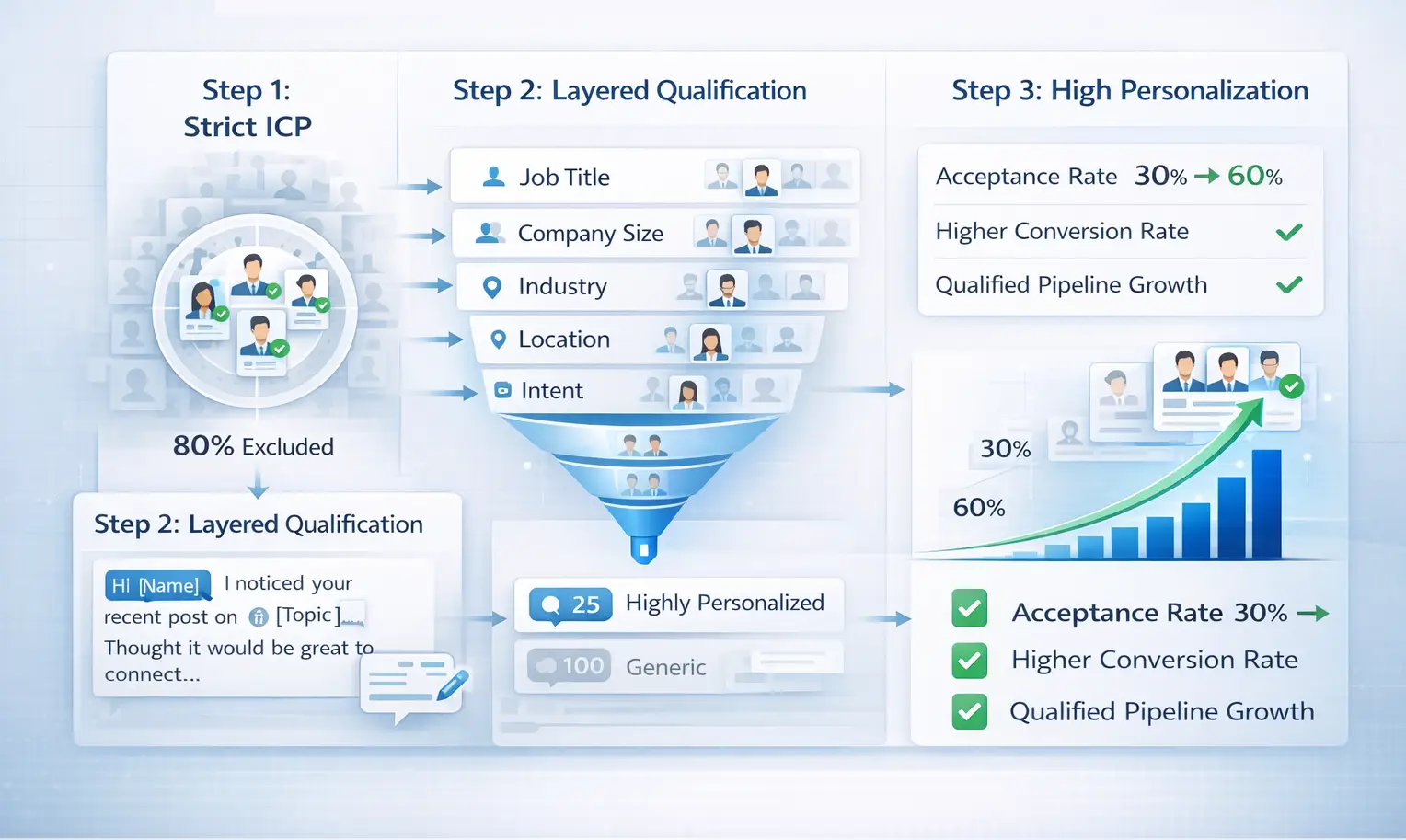 2026 reality: Daily connection limits dropped to 50-70 requests for accounts using automation. This forces quality over quantity.