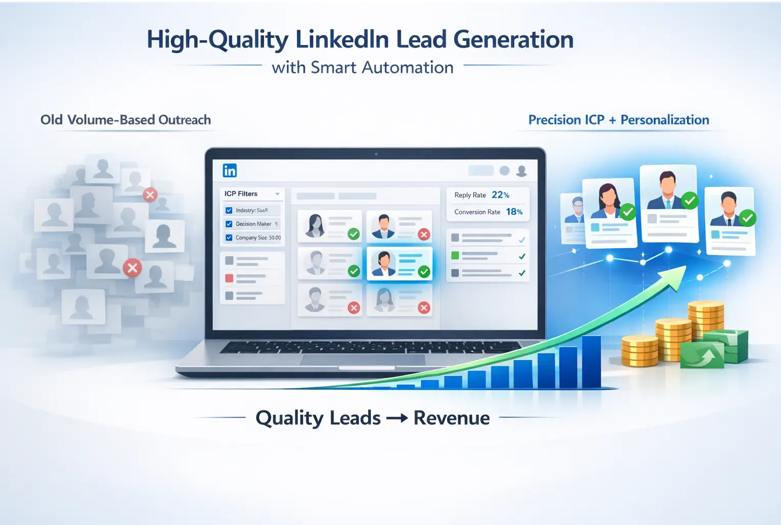 High-quality LinkedIn leads come from precise ICP targeting, multi-layer qualification, personalized messaging, and intent signals, not volume-based outreach.