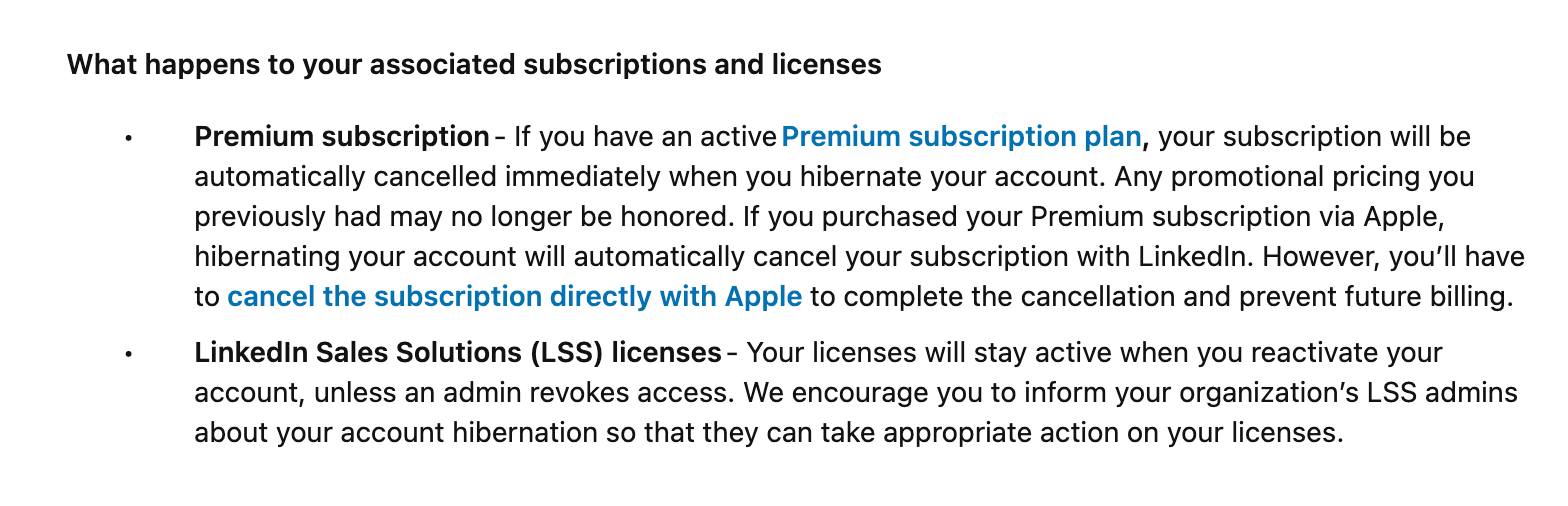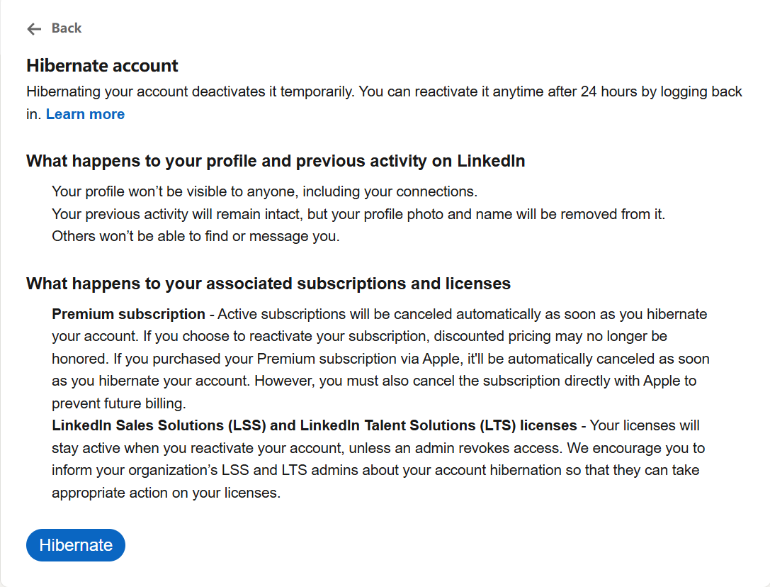 - You cannot hibernate if you are a LinkedIn Page admin or have an active LinkedIn Premium subscription (cancel first)