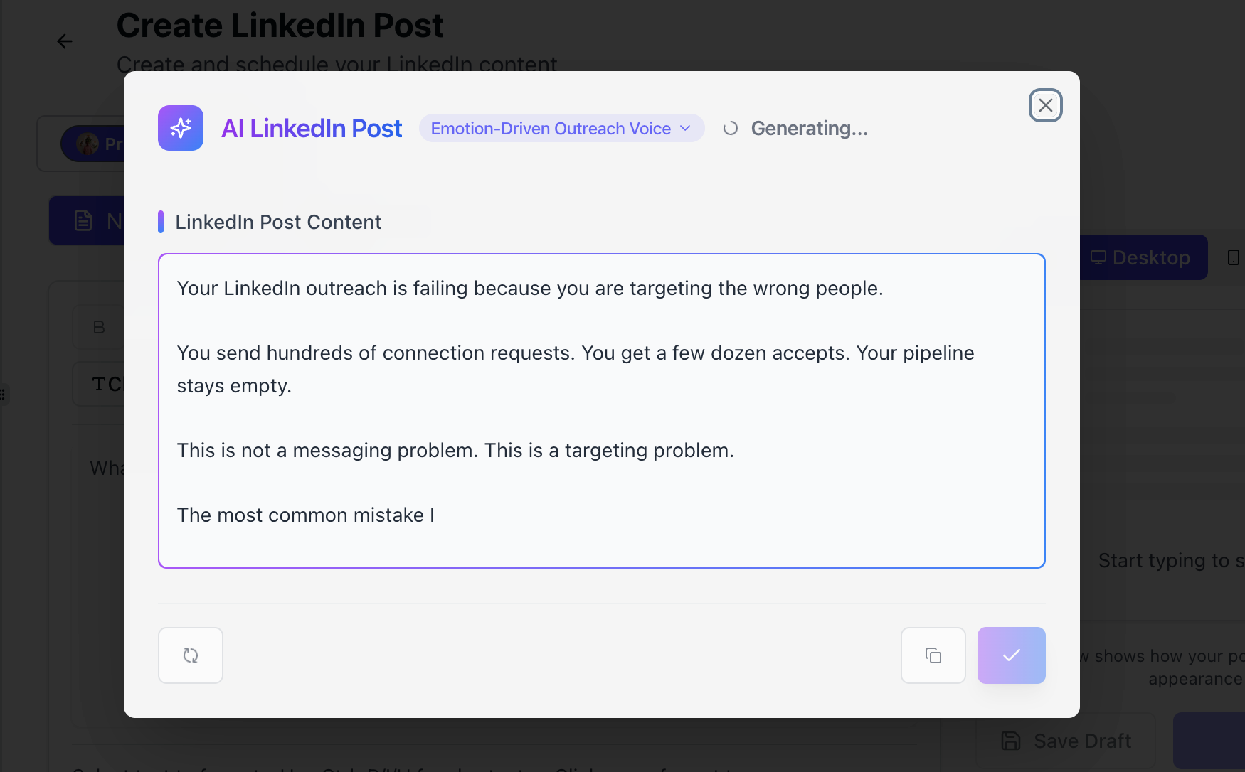 - Schedules and publishes LinkedIn posts on your behalf using its AI post writing feature