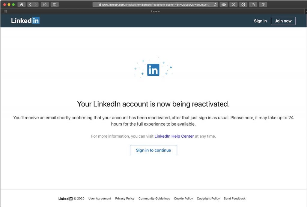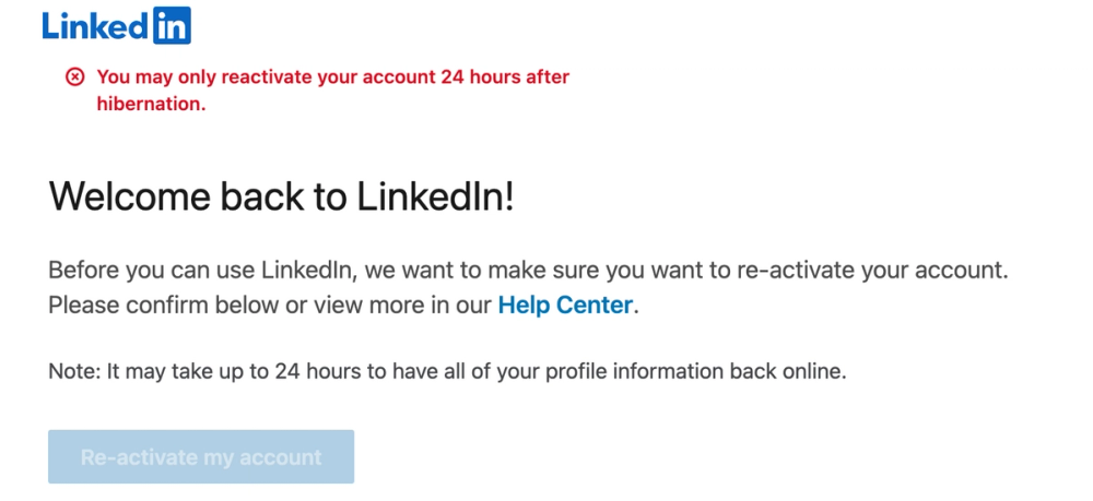 - LinkedIn will detect that your account is hibernated and show a reactivation prompt