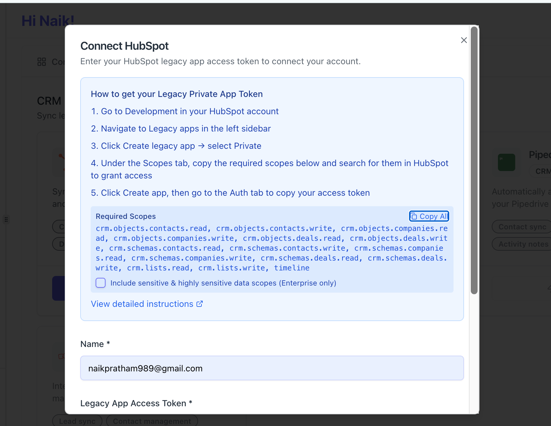 Your HubSpot app needs specific scopes to work with Bearconnect. Copy these required scopes from the Bearconnect connection form using the "Copy All" button:
