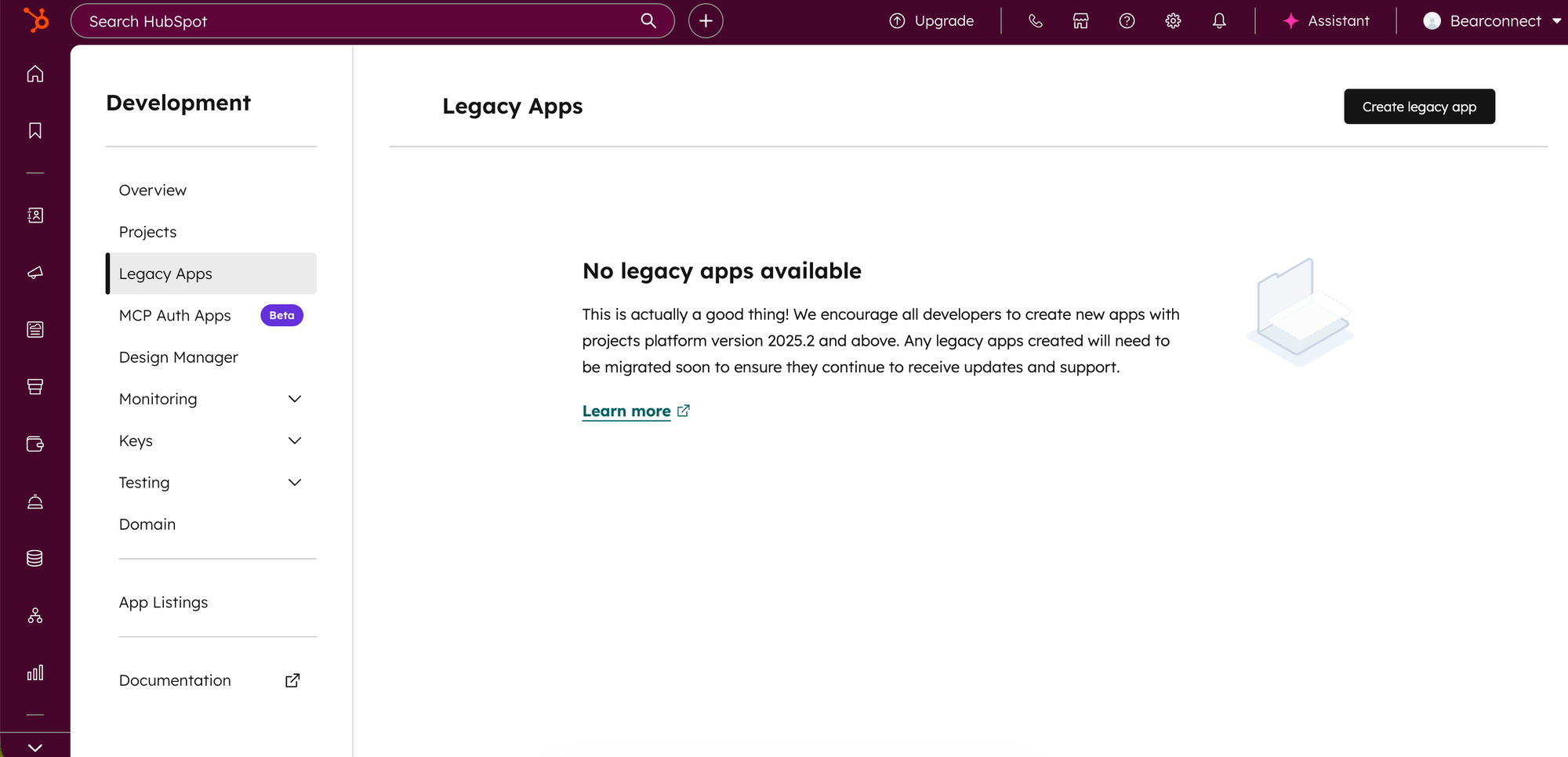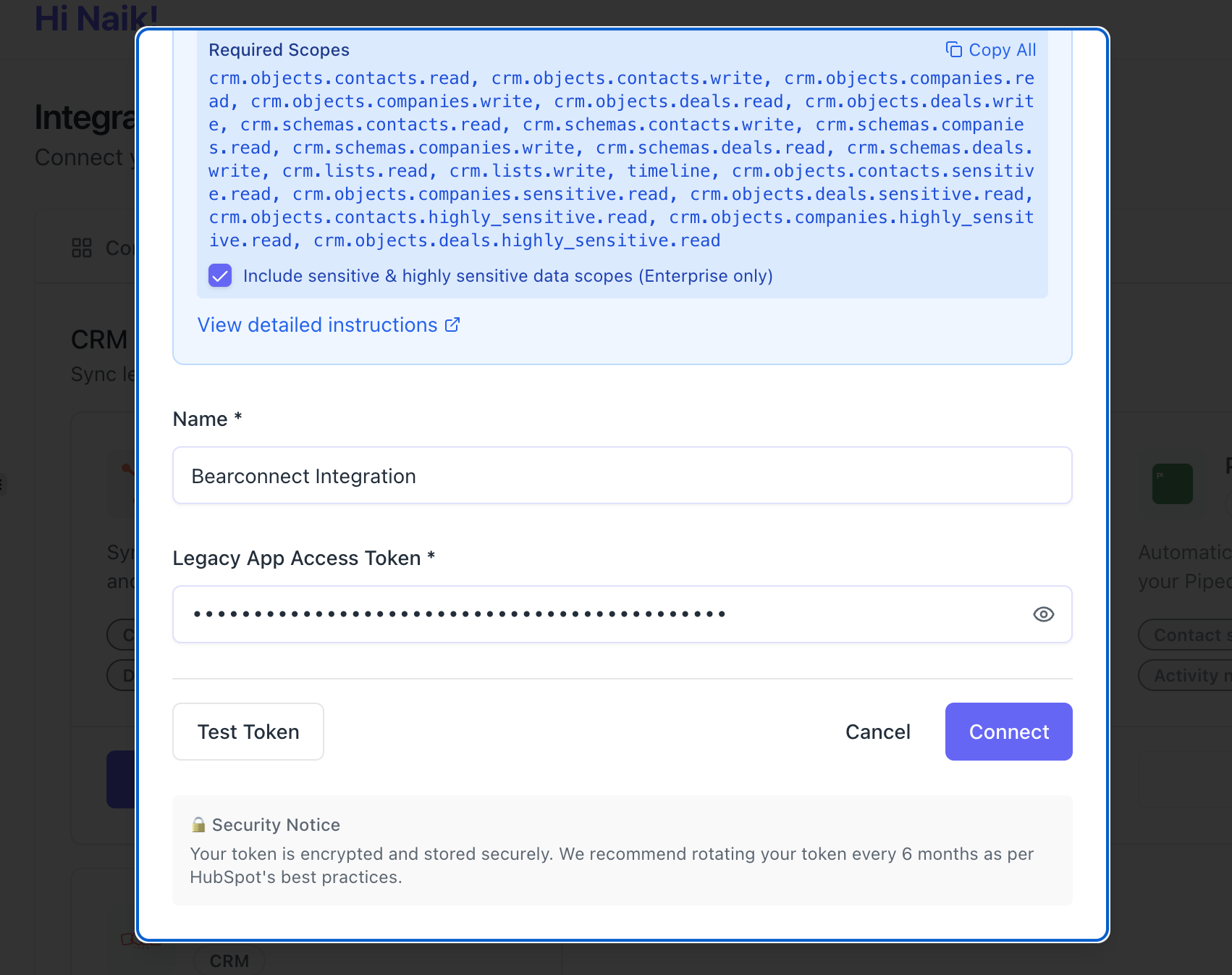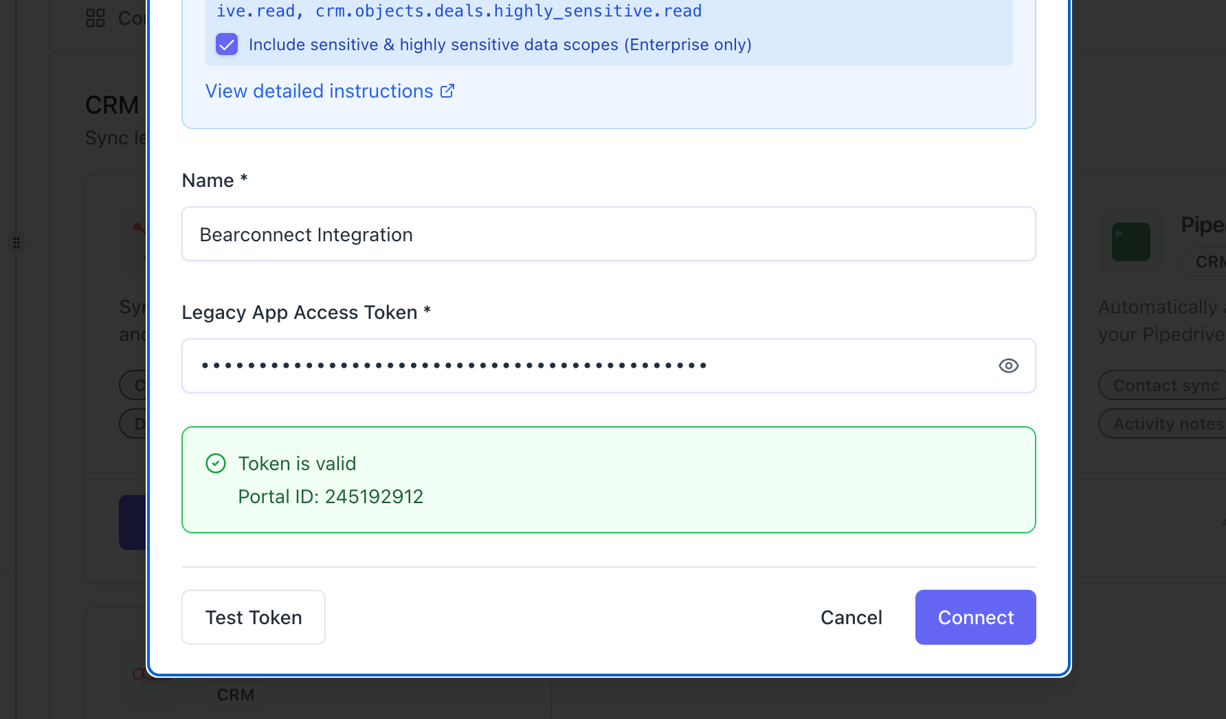 Connect Bearconnect to HubSpot in 10 minutes by creating a Legacy App in HubSpot, configuring required API scopes, copying your access token