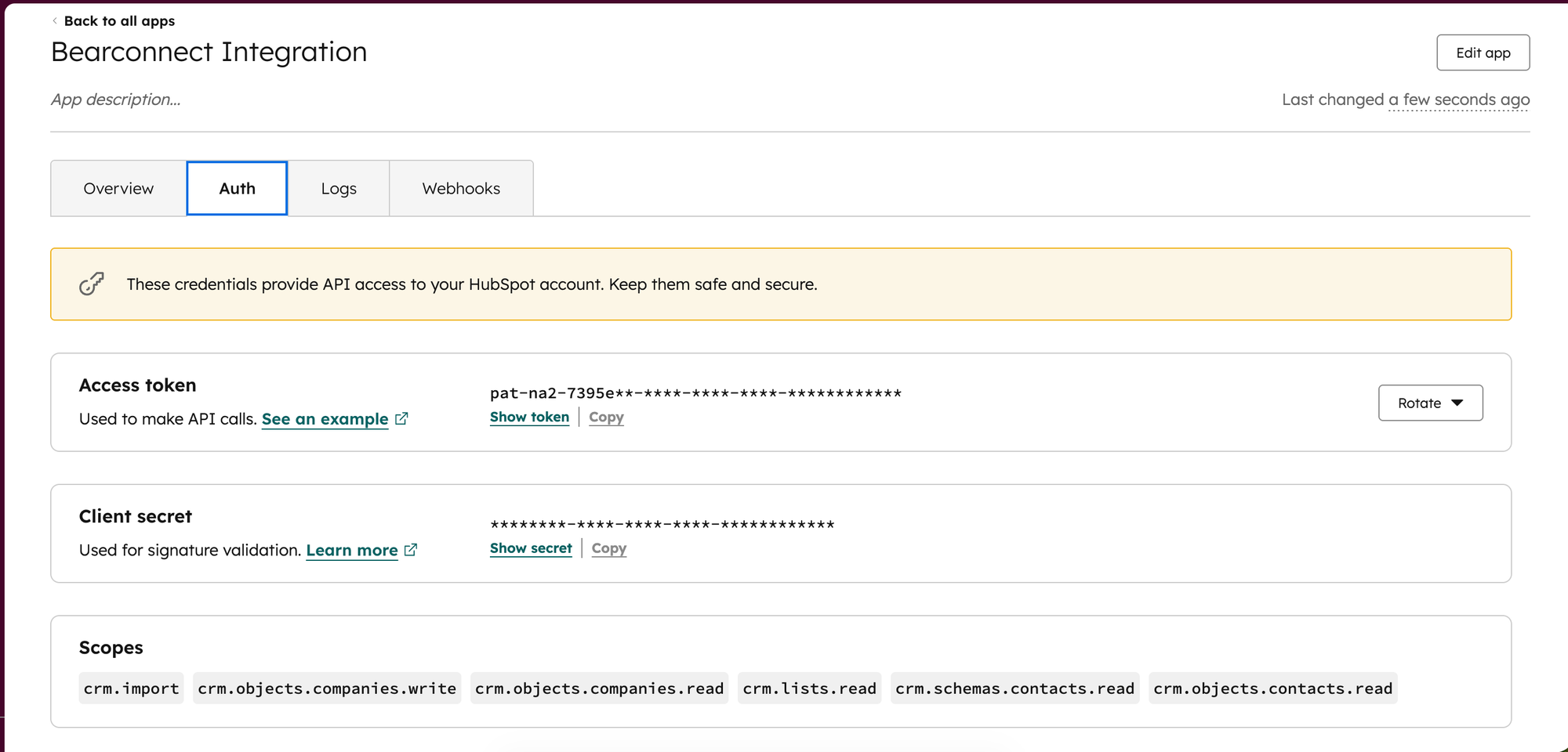 HubSpot recommends rotating tokens every 180 days for security. Bearconnect tracks your token age and shows a warning banner when rotation is due.