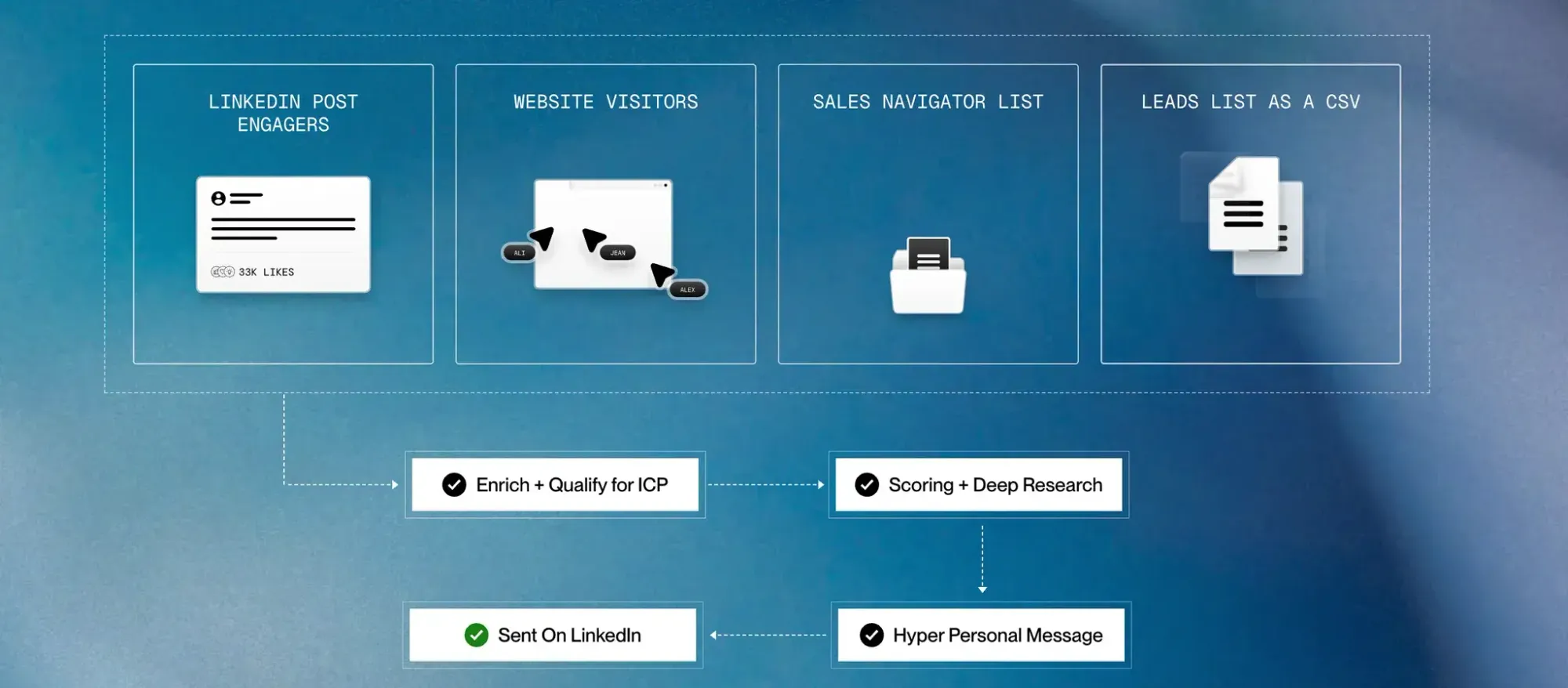 - Built-in ICP scoring automatically qualifies prospects before outreach begins.