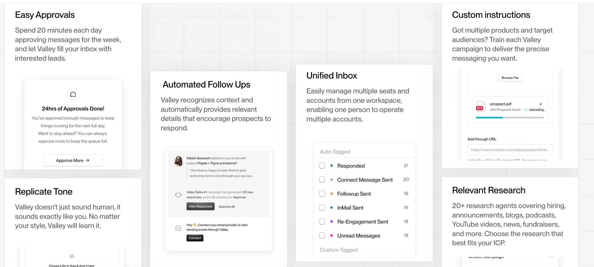 - Unlike template-based tools, Valley researches prospects individually, pulling insights from multiple data sources to create authentic, personalized outreach that converts.