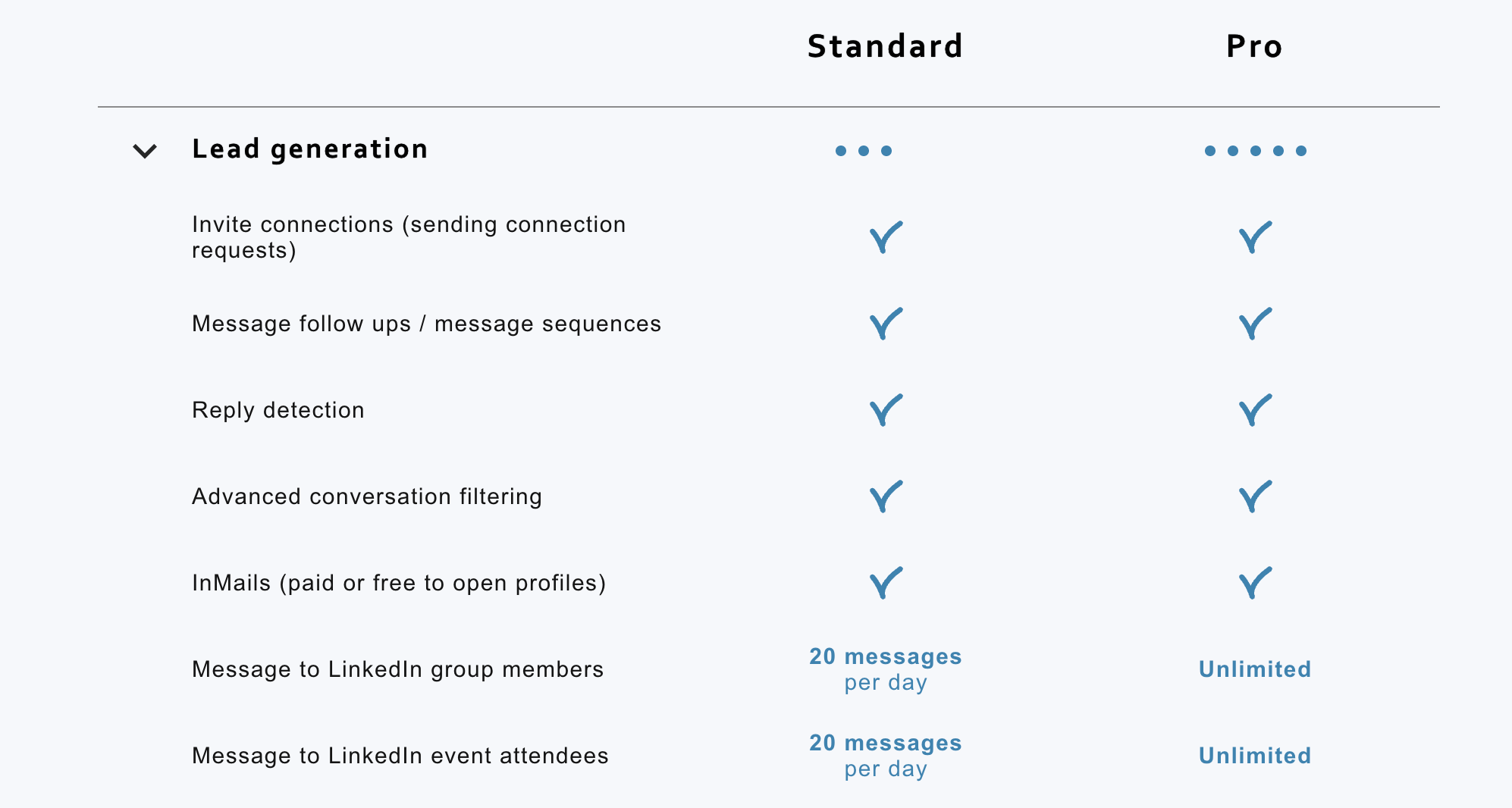 The Pro plan removes the 20/day action limit on group messaging, event outreach, and post engagement. It also provides 5x more email finder credits (3,100 vs. 620 monthly) and priority customer support. Standard plan restricts these actions significantly.