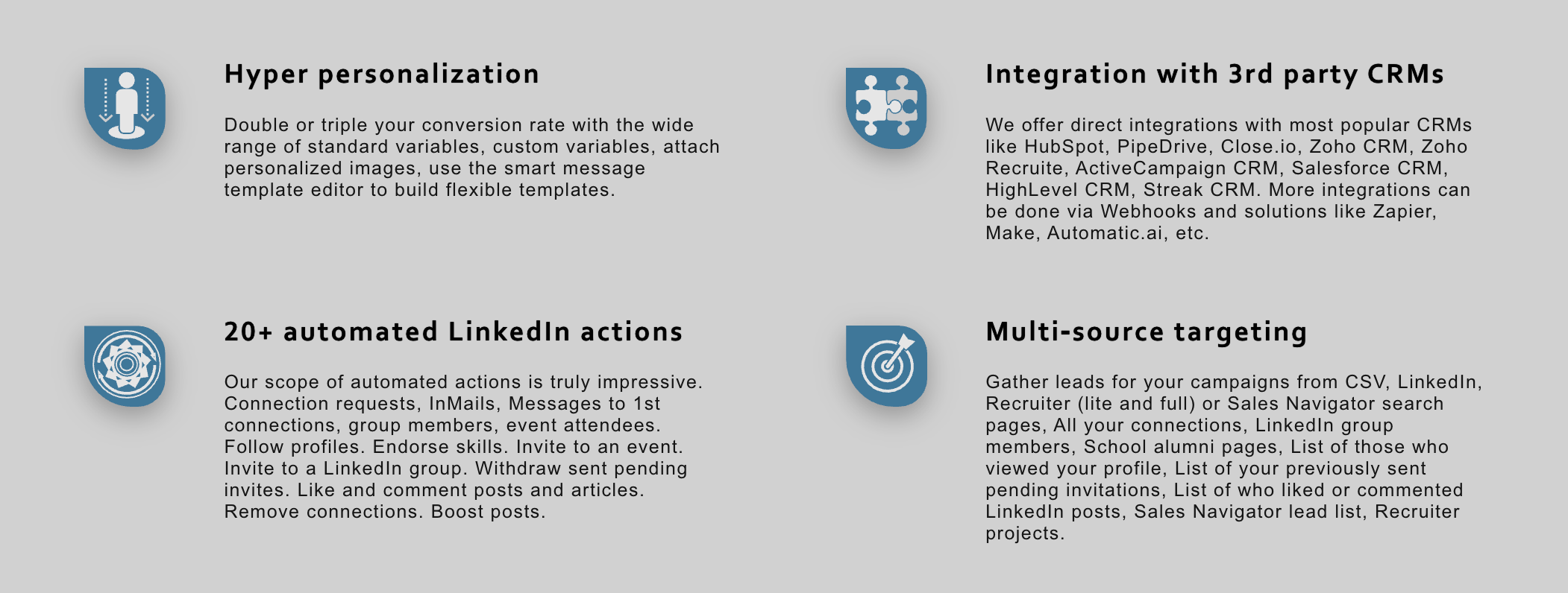 The platform delivers 20+ automated LinkedIn actions including:
