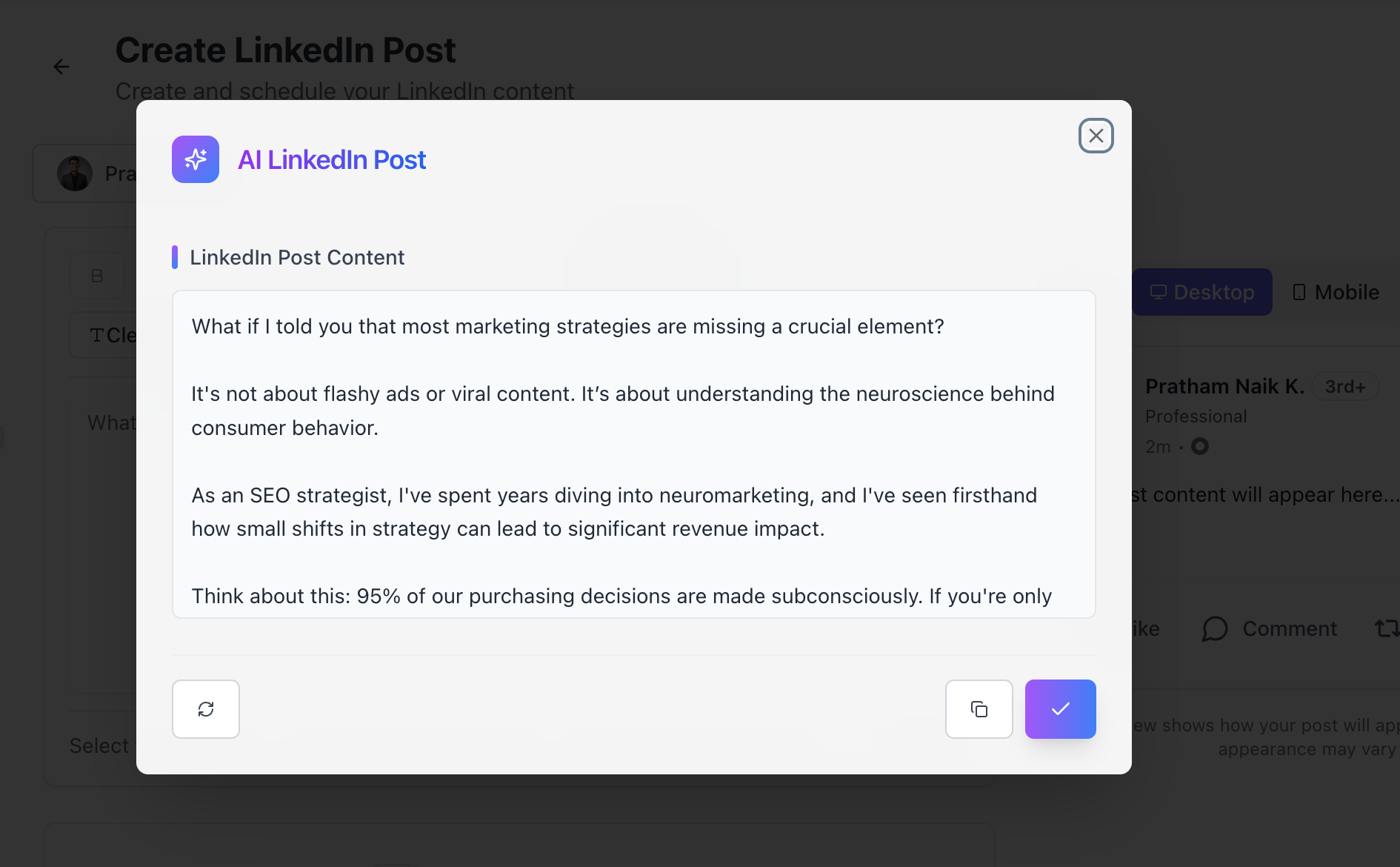 Built-in AI generates engaging LinkedIn posts in seconds: