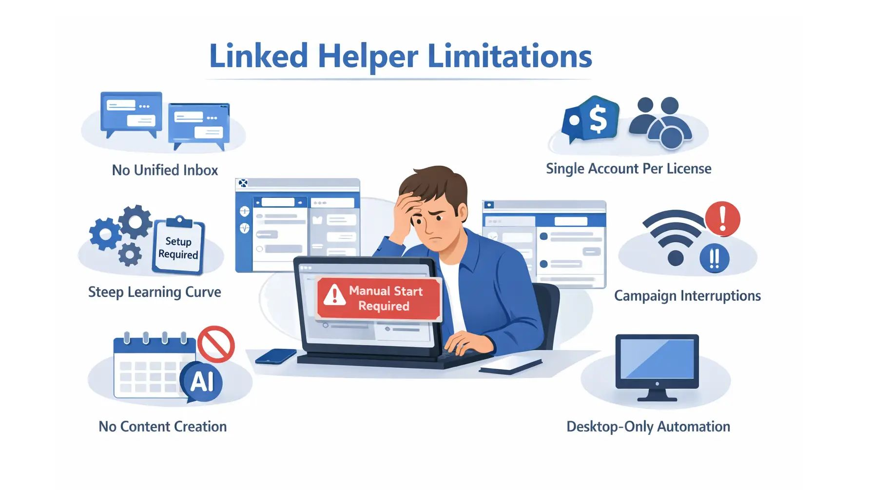 Linked Helper forces manual account switching, causing missed messages and delayed responses.