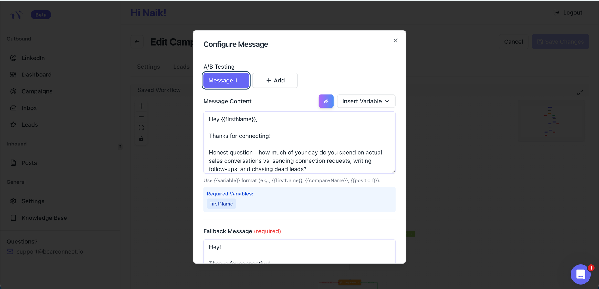 Use Bearconnect's personalization tokens like {{firstName}}, {{companyName}}, and {{jobTitle}} to customize each message. Reference specific details like recent posts, shared interests, or mutual connections. Keep requests under 180 characters and focus on mutual benefit rather than immediate asks.
