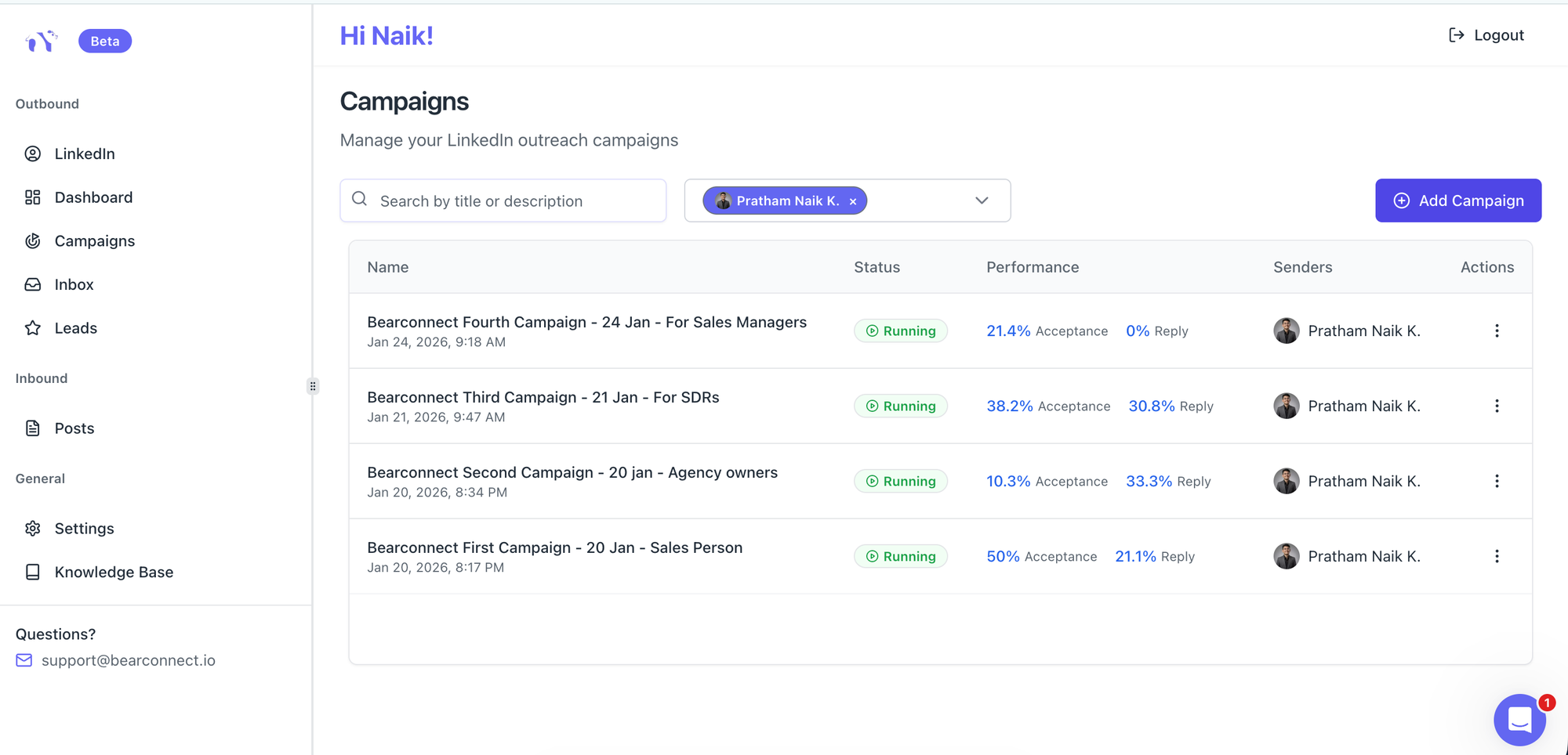 Yes, Bearconnect supports unlimited LinkedIn account connections on one dashboard. You pay $67 per month for each LinkedIn account you connect ($57 per account for 5+ accounts). The Unified Inbox lets you manage all conversations from one centralized platform.
