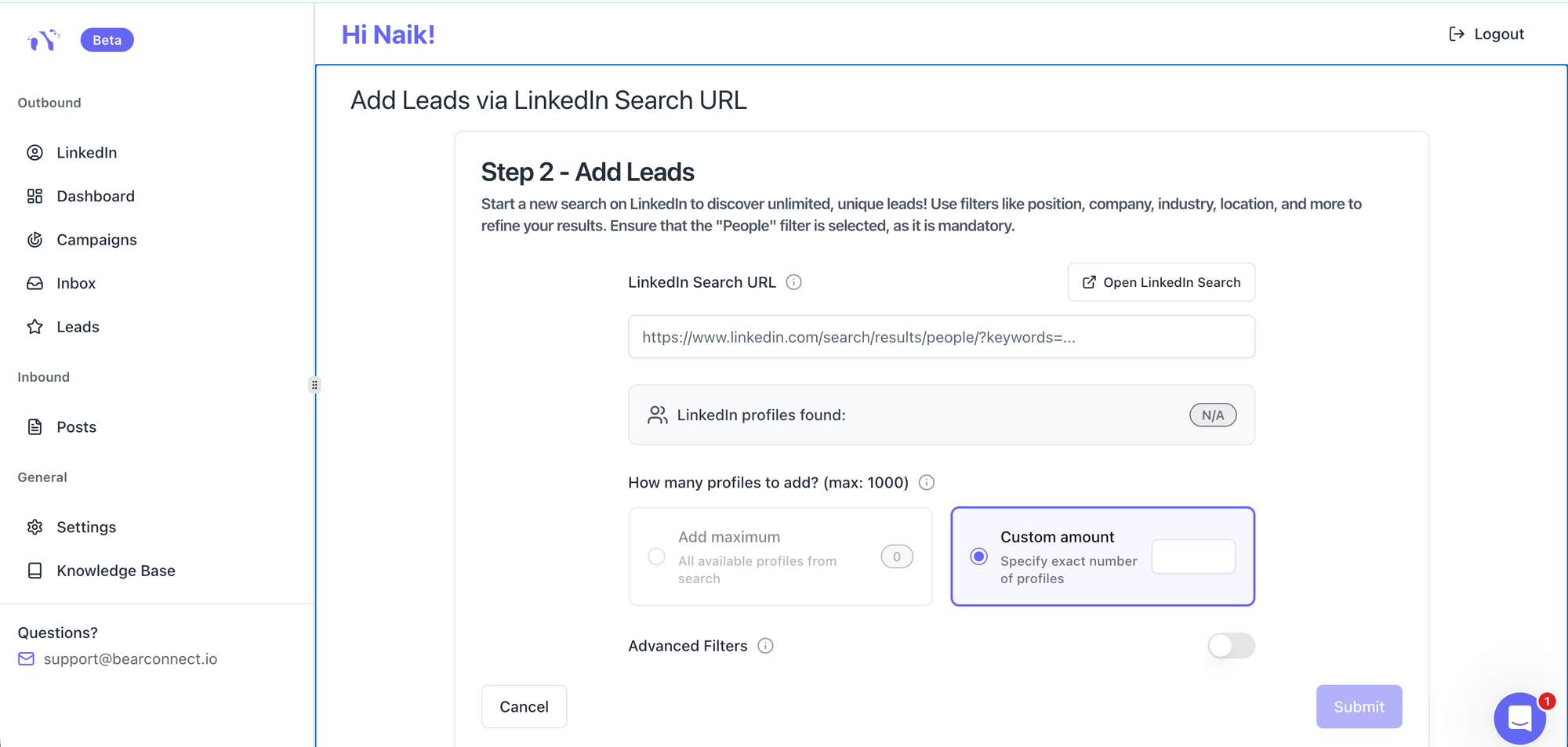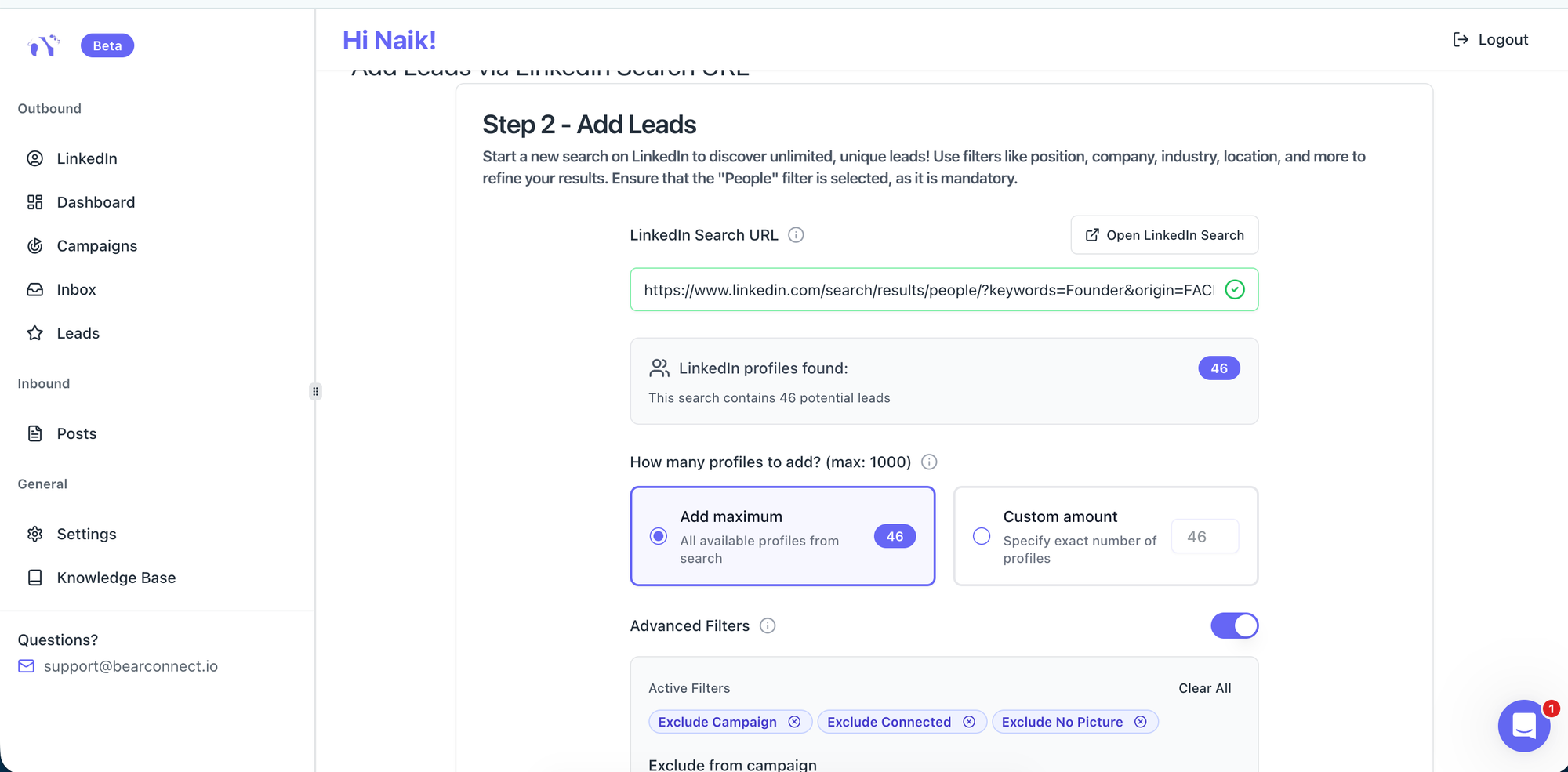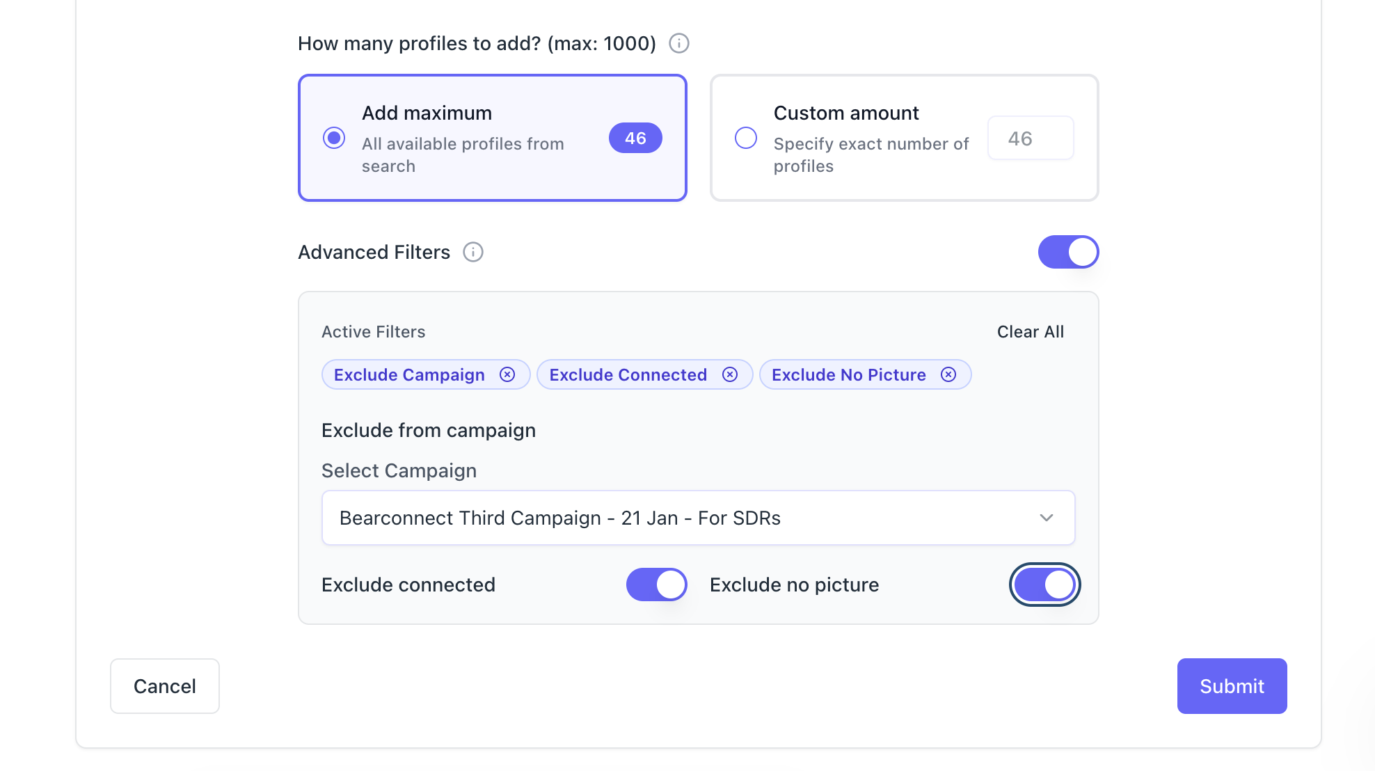 Choose how many leads to add to this campaign. Use Bearconnect's advanced filters to: