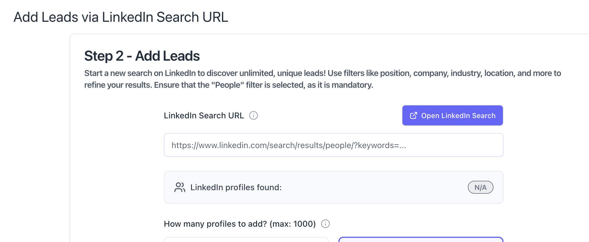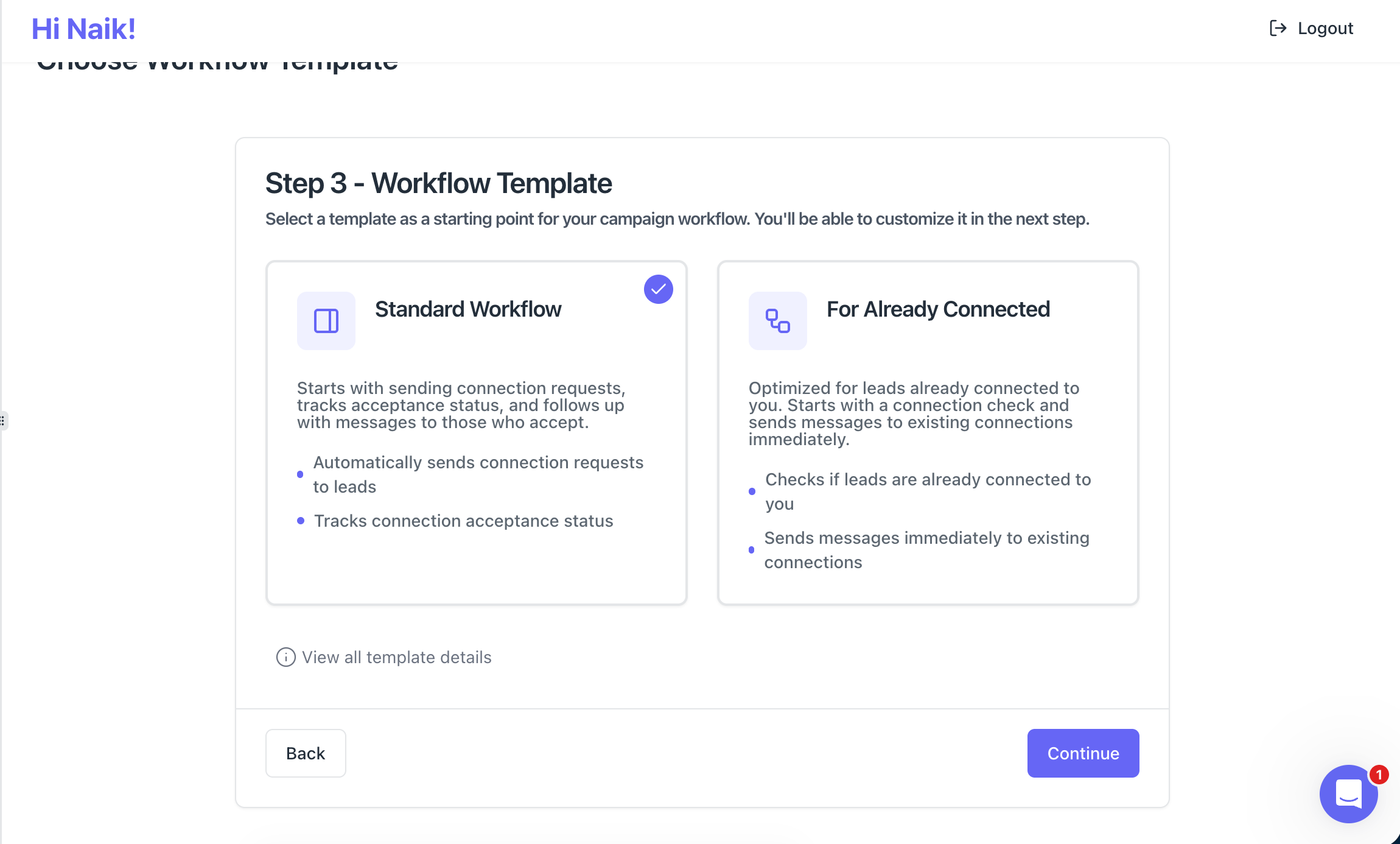- Choose between "Already Connected" (send messages to existing network) or "Standard Workflow" (send connection requests and messages).