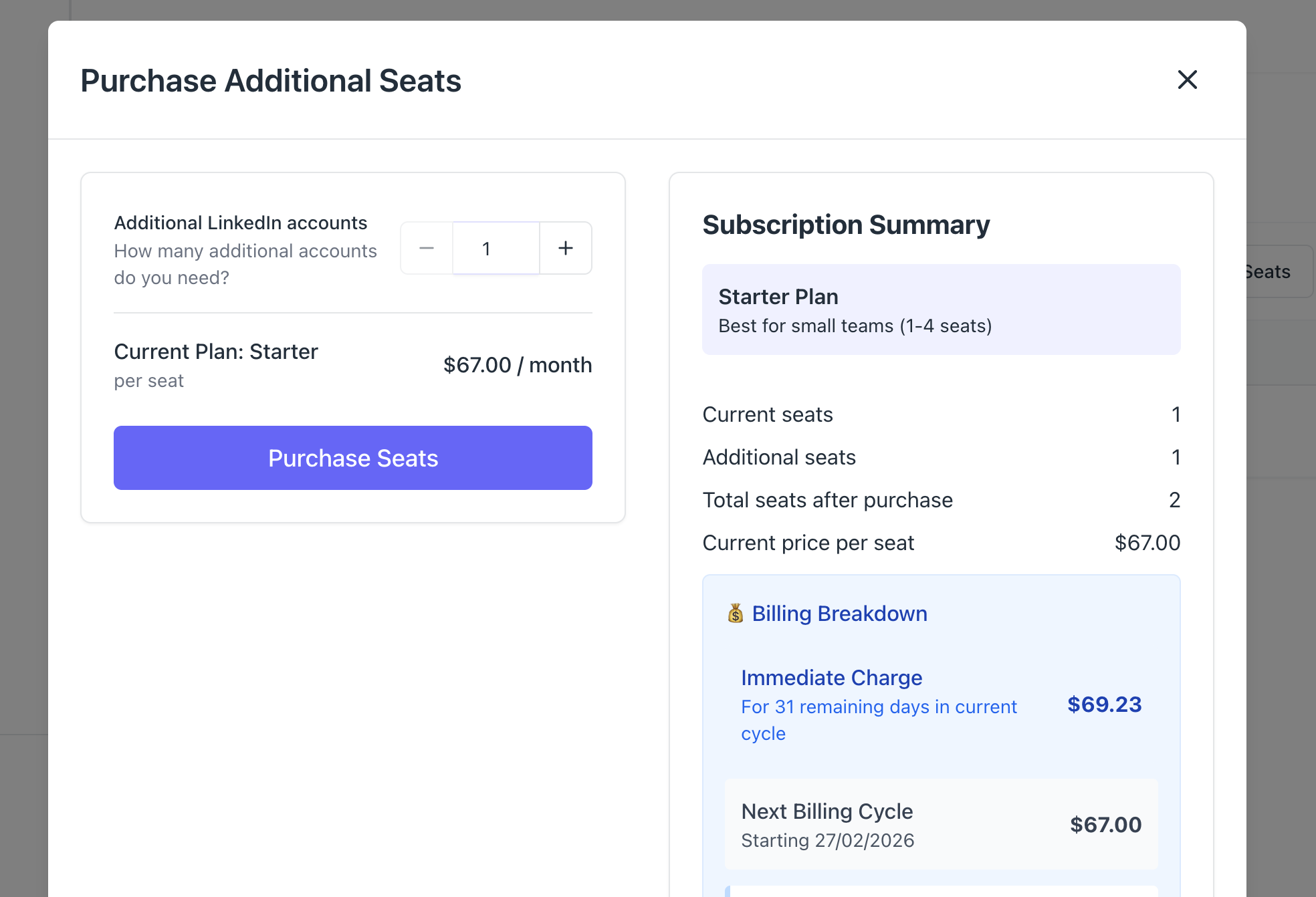 Remember, you pay $67 per month for each LinkedIn account you connect, or $57 per month per account when connecting 5 or more.