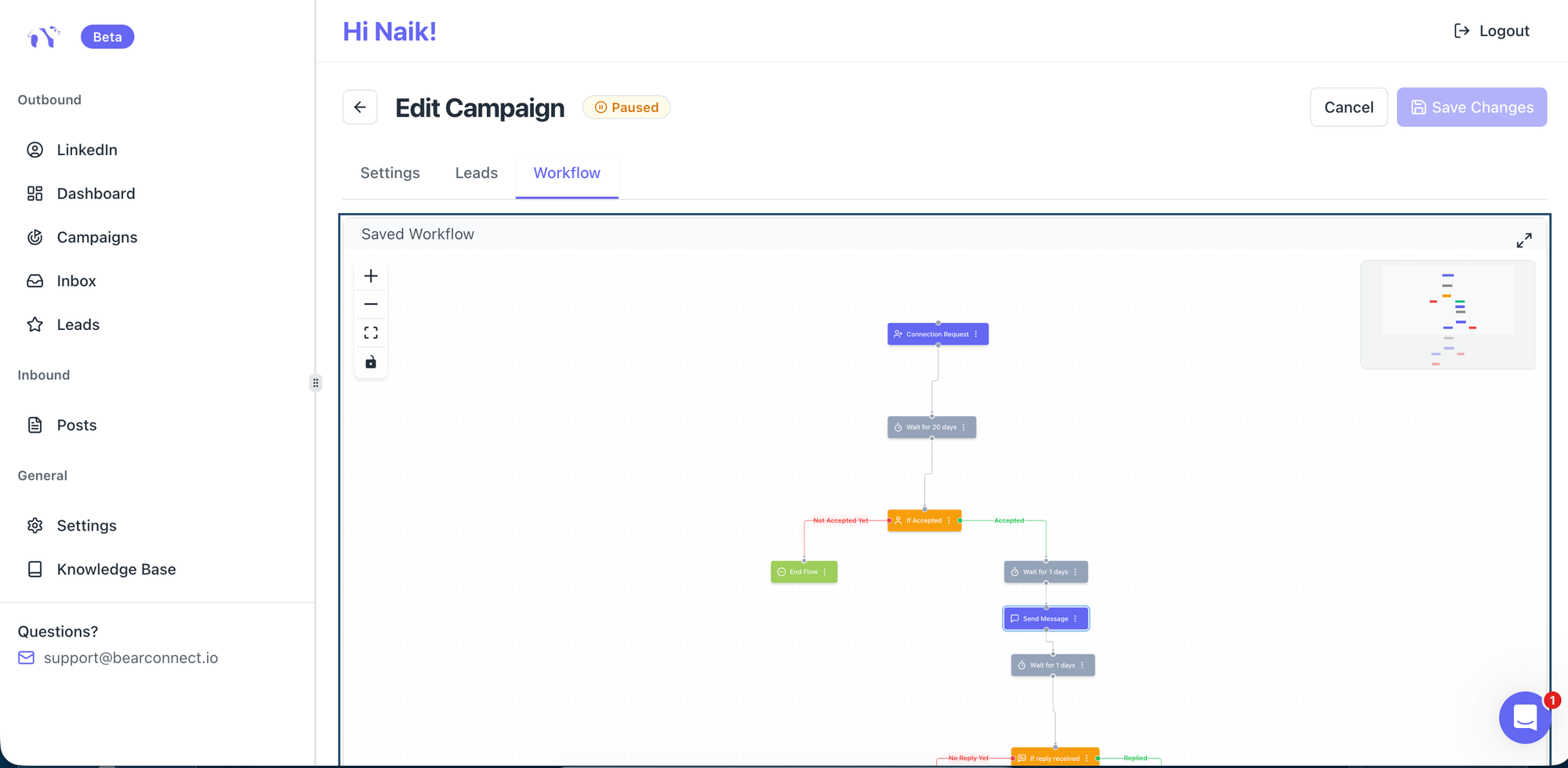 - Bearconnect operates independently of LinkedIn Sales Navigator and mimics organic user behavior through smart throttling and natural action pacing.
