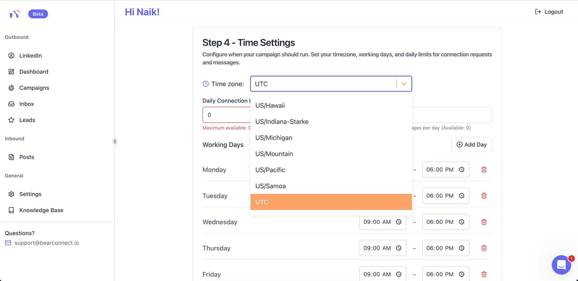 Select your time zone for accurate message timing. Choose which days to run outreach (Monday-Friday recommended for B2B campaigns).