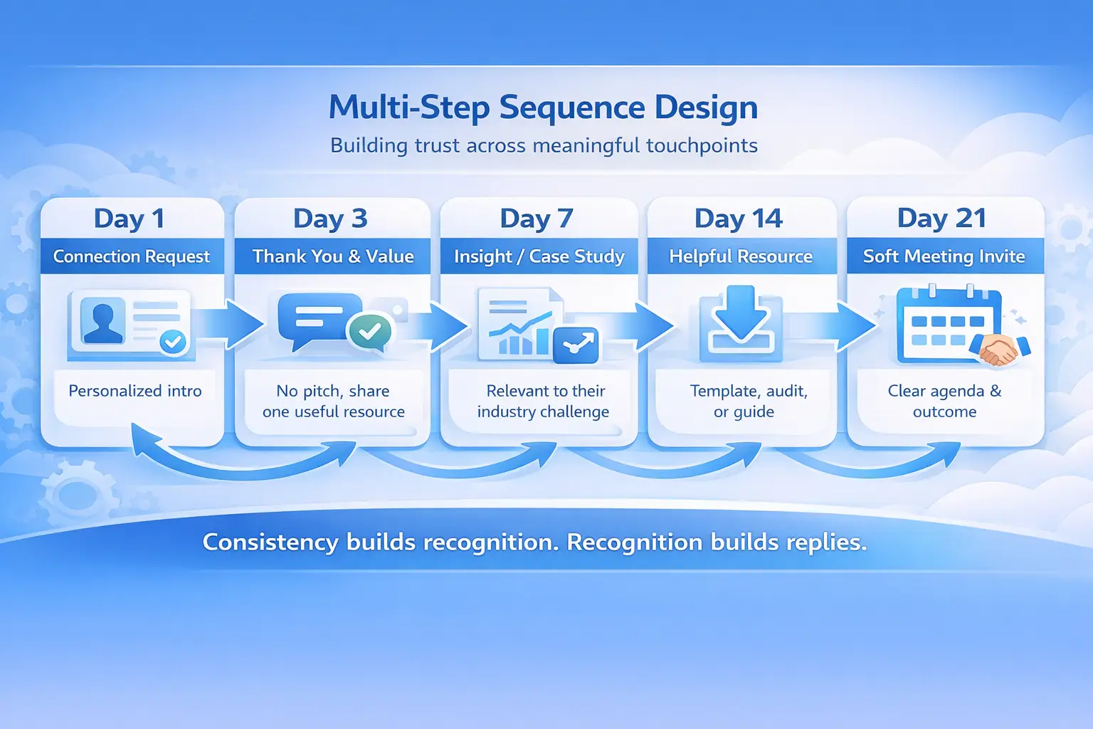 Single-message outreach fails. Repeated, meaningful touchpoints gradually strengthen recognition and credibility.