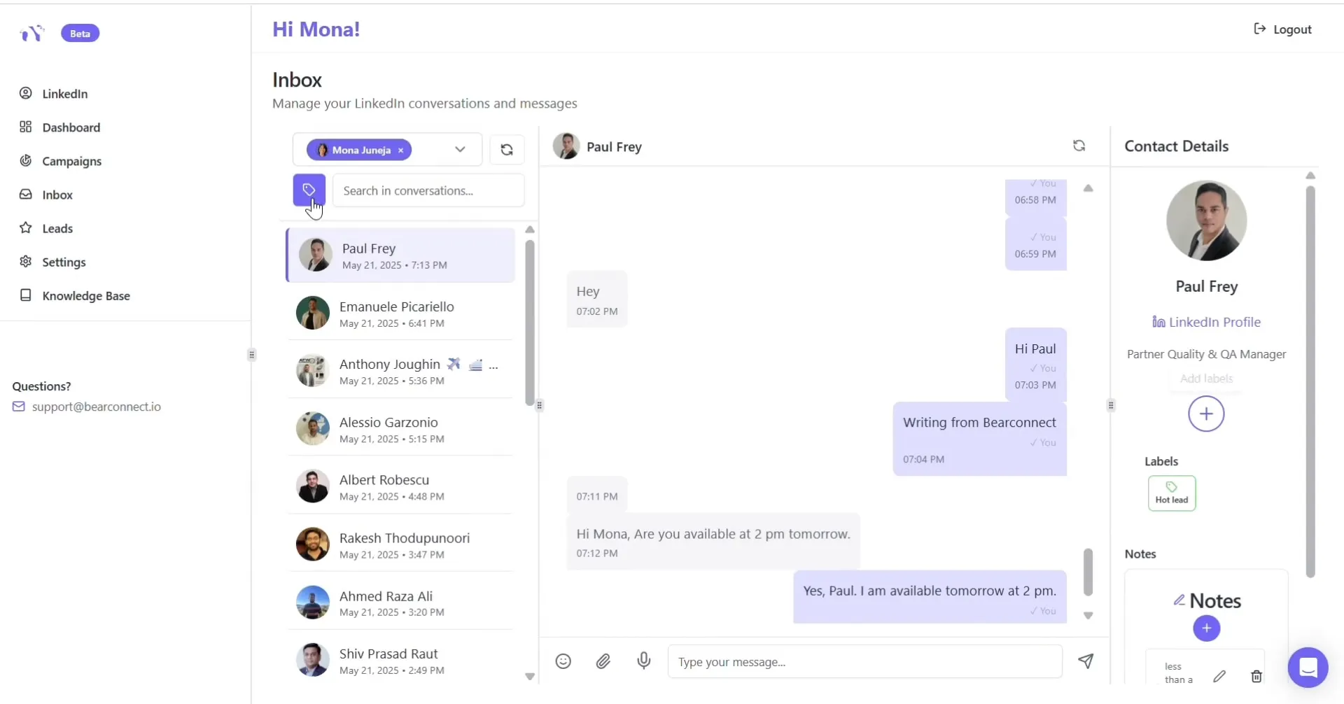 Bearconnect's unified inbox handles unlimited LinkedIn account connections, so whether you are managing one profile or five, every conversation stays organized.