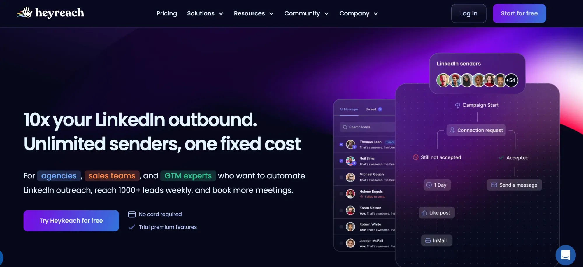 HeyReach is purpose-built for agencies running campaigns across multiple LinkedIn accounts simultaneously, with smart account rotation to stay within LinkedIn's daily action limits.