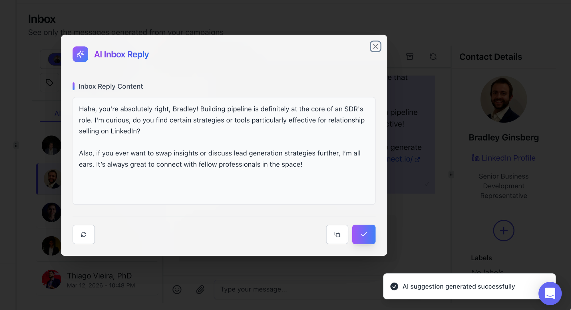 AI Inbox Reply reads your existing conversation history with a prospect and analyzes their LinkedIn profile (job title, industry, role context) to generate a personalized reply automatically. It is not a saved template. It creates a context-specific message based on who the person is and what was already said in the thread.