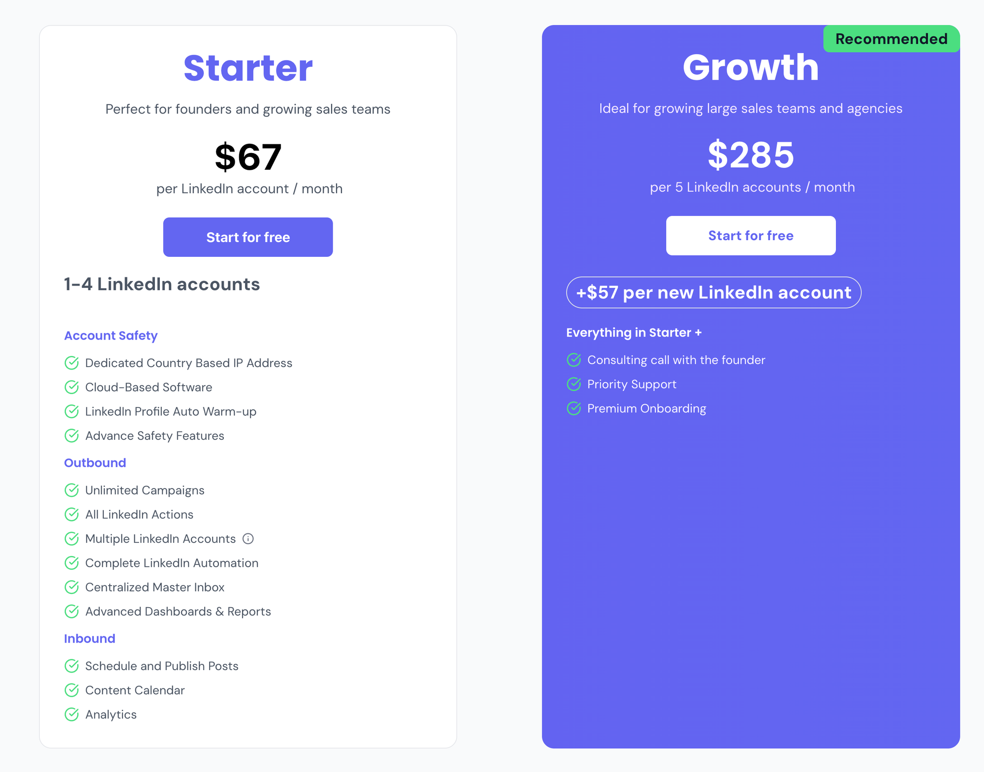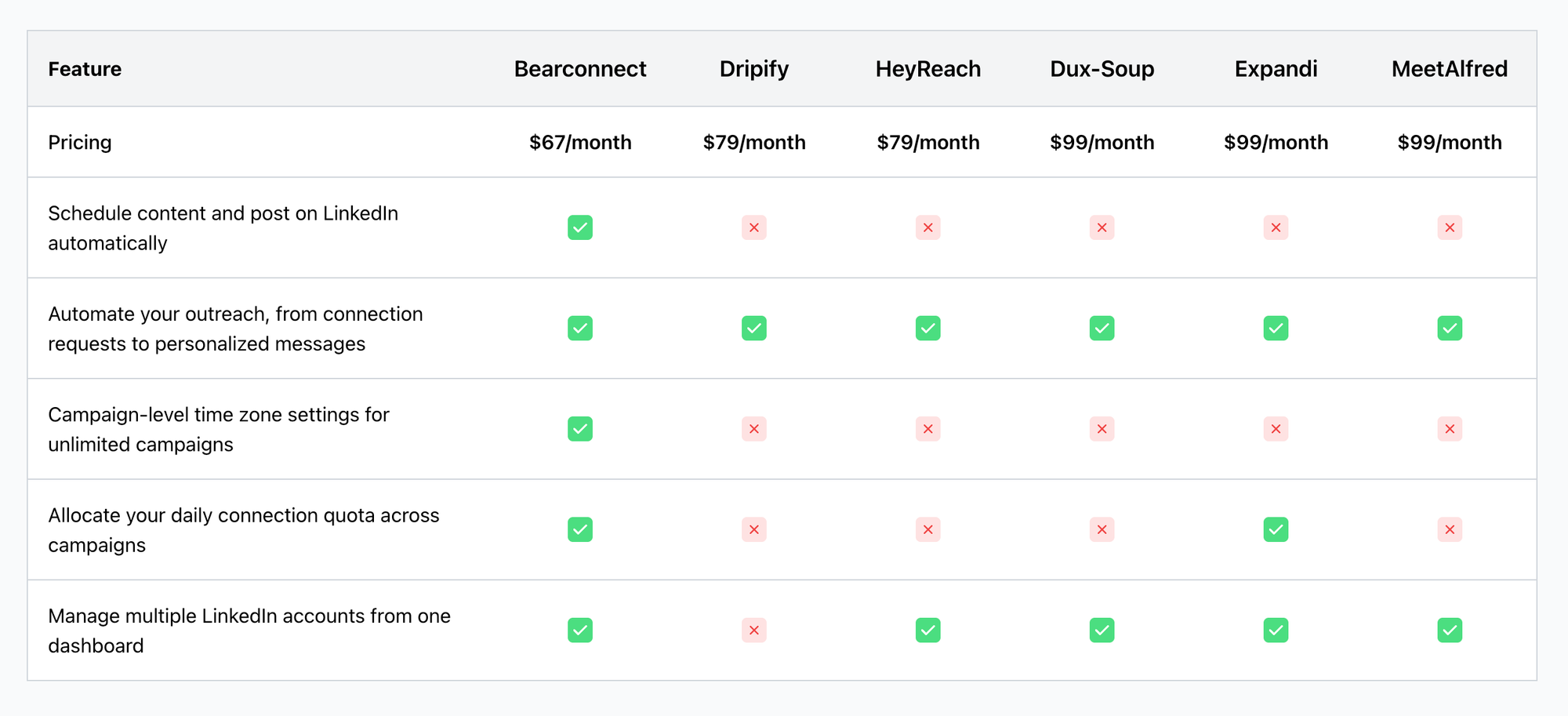Prices range from $14.99 to $99 per month depending on features and account limits. Bearconnect starts at $67/month per LinkedIn account and drops to $57/month per account for 5 or more accounts, making it one of the most cost-efficient options for teams and agencies.