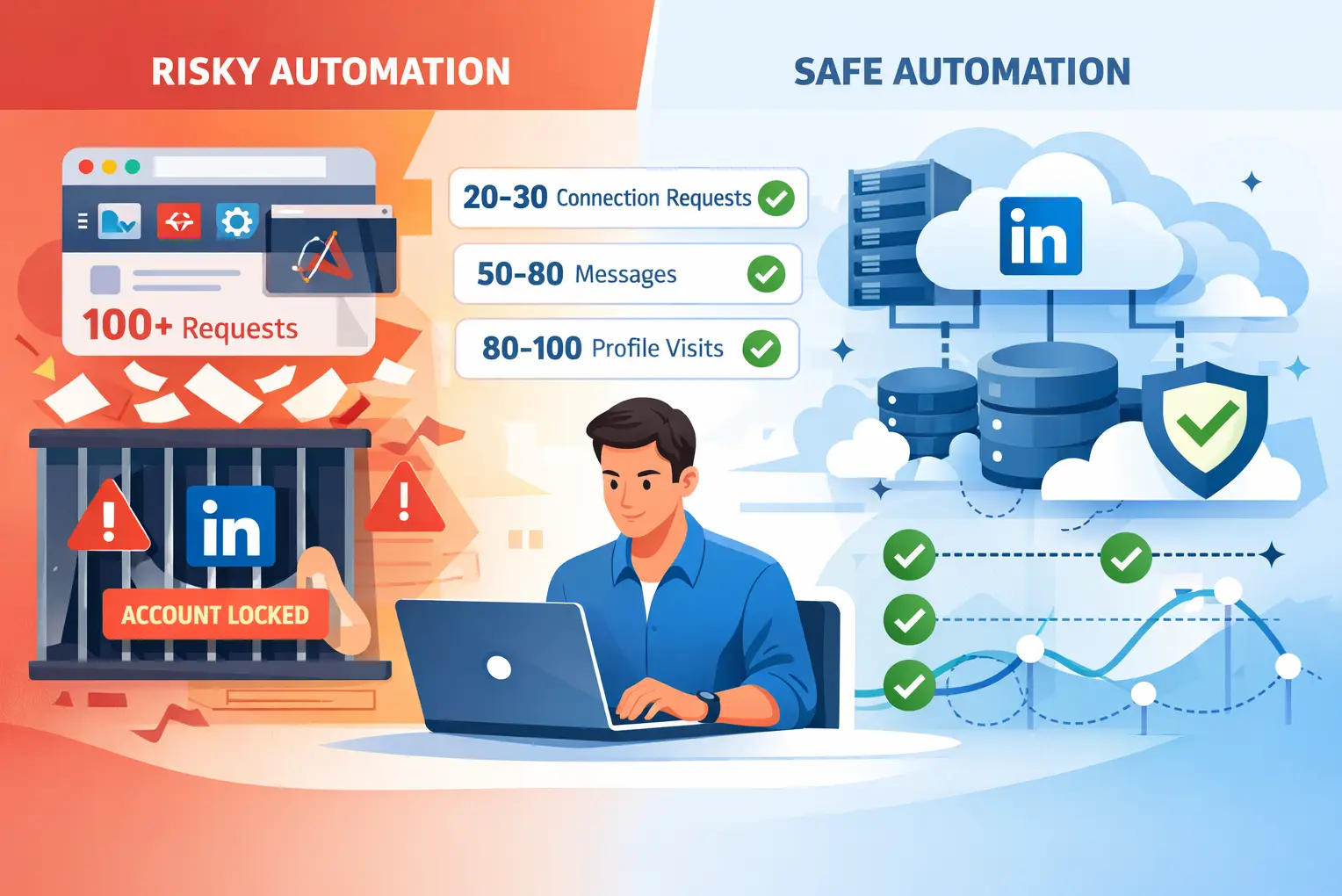 Set your automation to 15 to 20 connection requests per day maximum. A conservative volume with a high acceptance rate is always safer than maximum volume with low engagement.