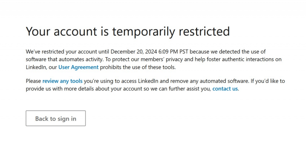 - Permanent ban: LinkedIn closes your account entirely. This usually happens after repeated violations or aggressive scraping activity.