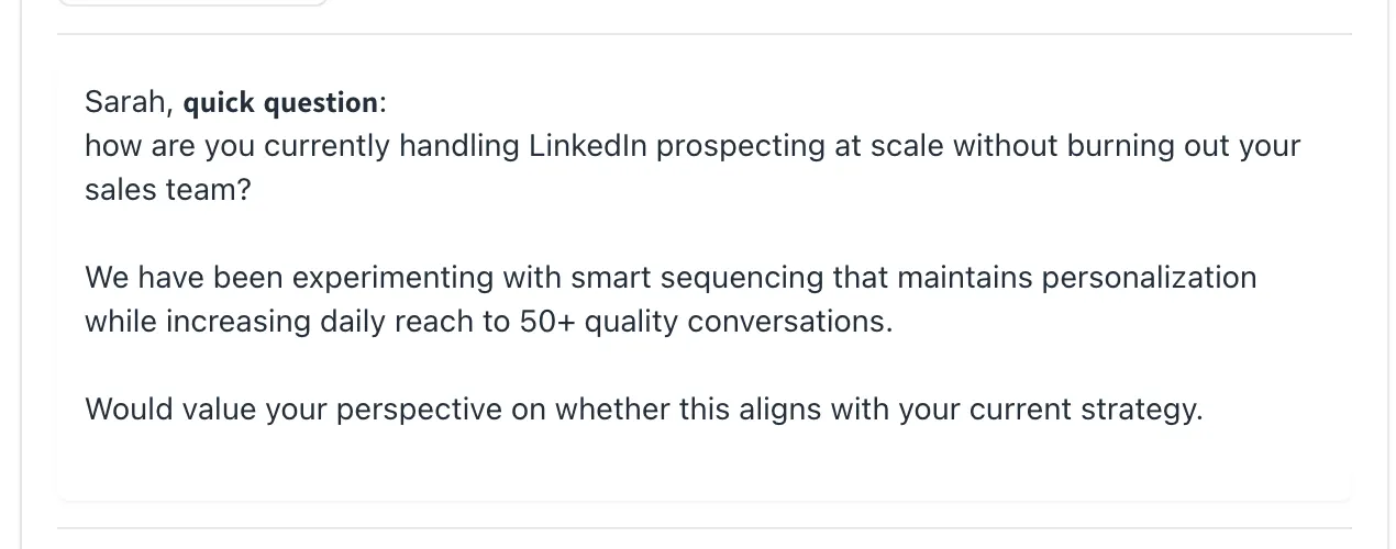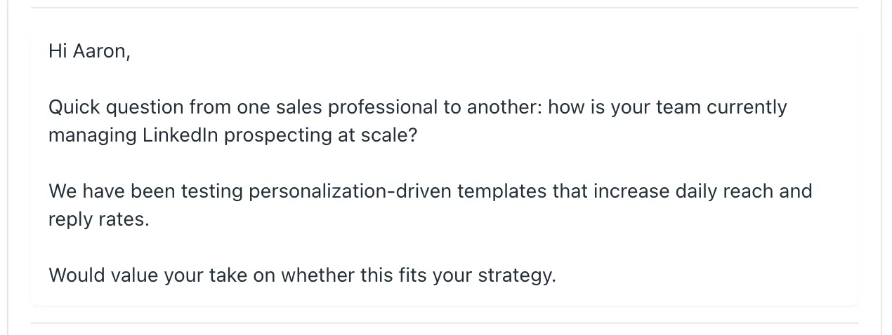 "[First Name], quick question from one sales professional to another: how is your team currently managing LinkedIn prospecting at scale? We've been testing approaches that maintain personalization while increasing daily reach. Would value your take on whether this aligns with your strategy."