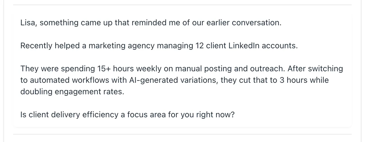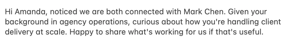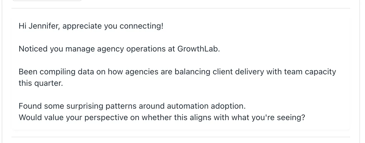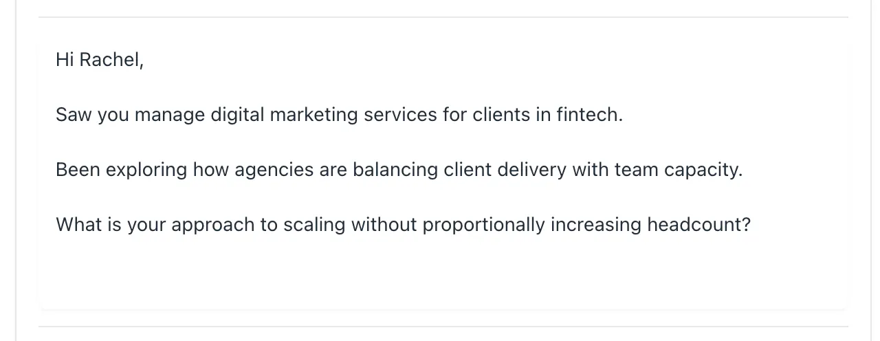 "Hi [First Name], saw you manage [service type] for clients in [industry]. Been exploring how agencies are balancing client delivery with team capacity. What's your approach to scaling without proportionally increasing headcount?"