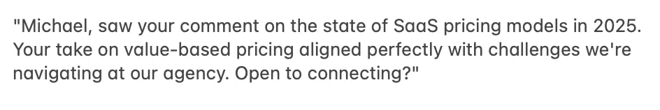 "Hi [First Name], noticed your recent post about [specific topic]. Your perspective on [detail] resonated with my work in [your field]. Would value connecting to exchange insights."