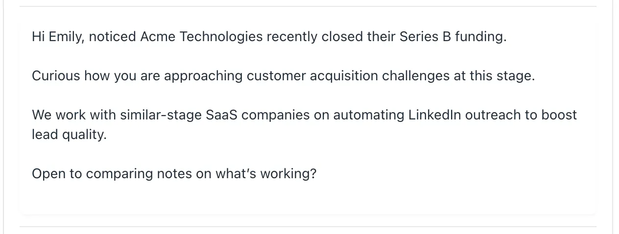 "[First Name], noticed [Company Name] recently [funding/launch/expansion news]. Curious how you're approaching [specific growth challenge] at this stage. We work with similar-stage companies on [solution area]. Open to comparing notes on what's working?"