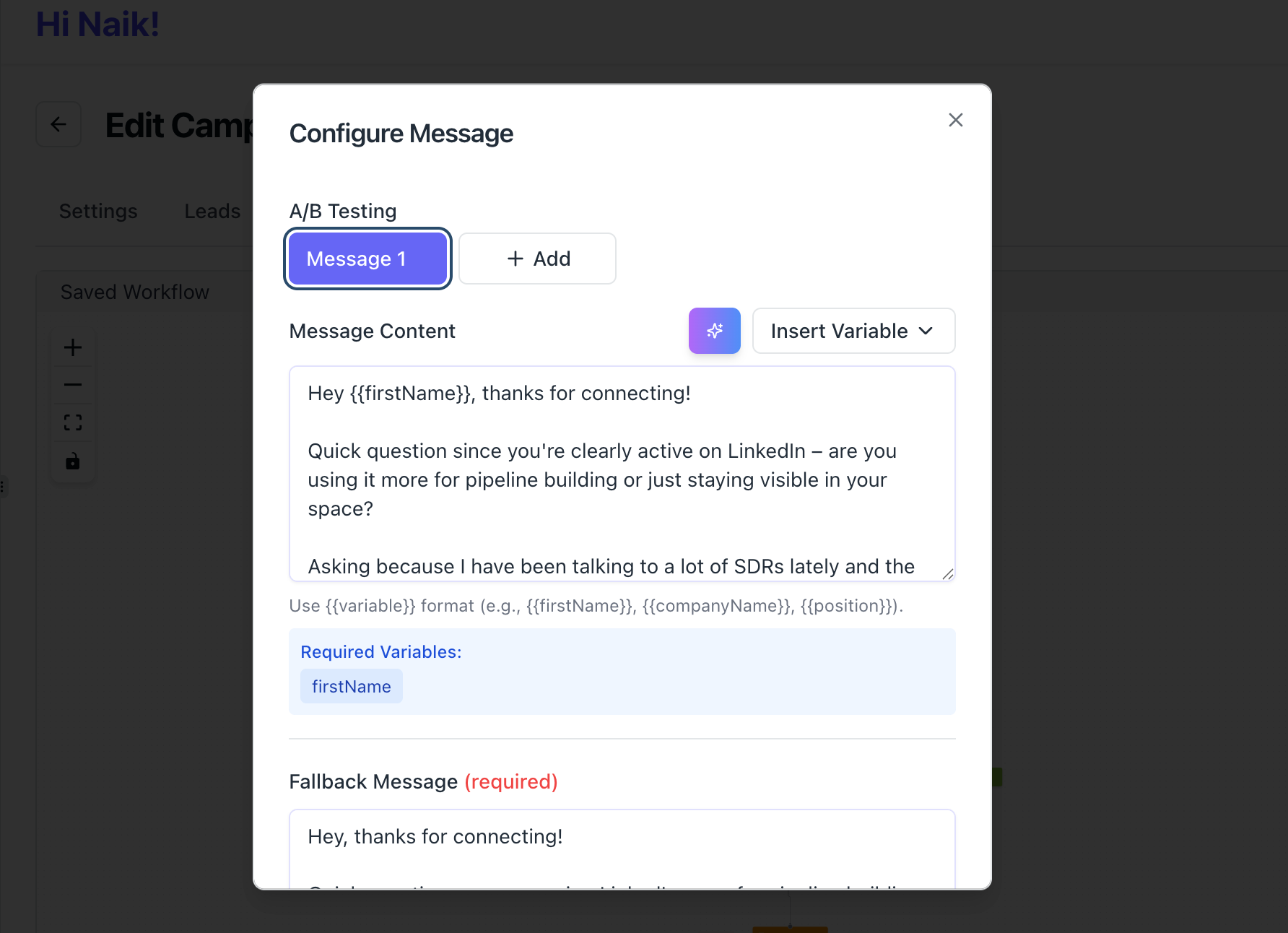 "Hi, I hope this message finds you well. I've been following your company for some time and I'd love to tell you about our platform that helps businesses like yours generate more leads through LinkedIn automation..."
