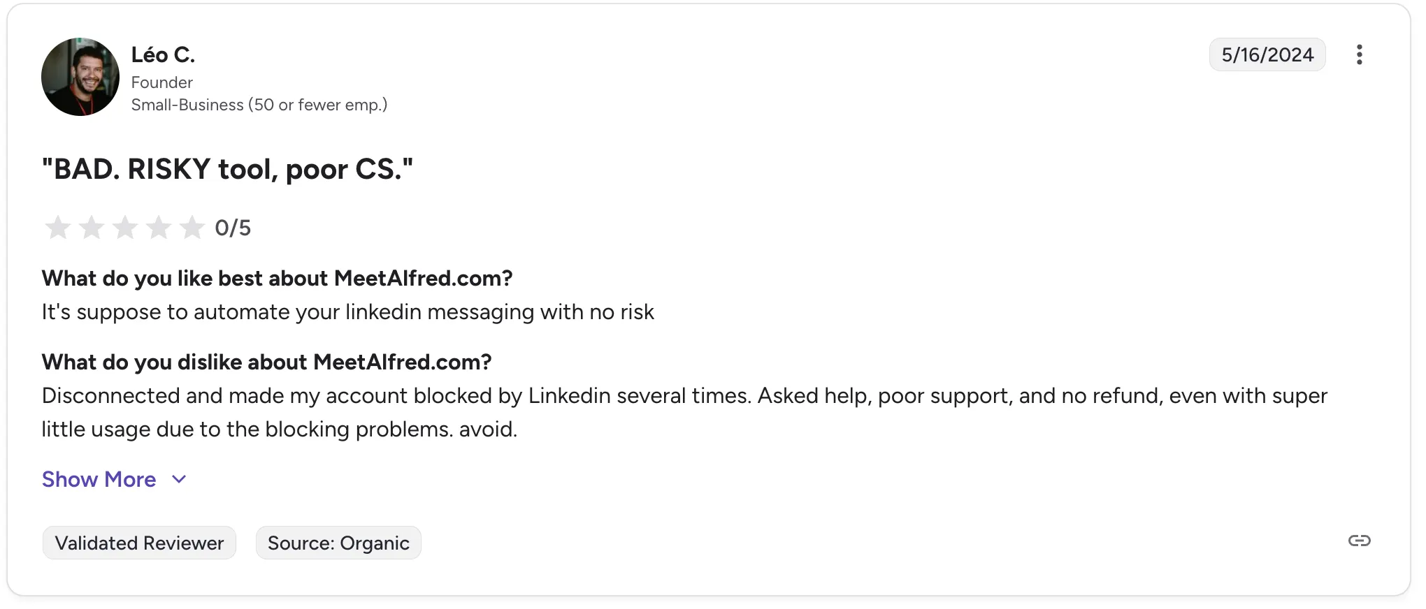 - Several public reviews mention blocked LinkedIn accounts and frequent disconnections.
