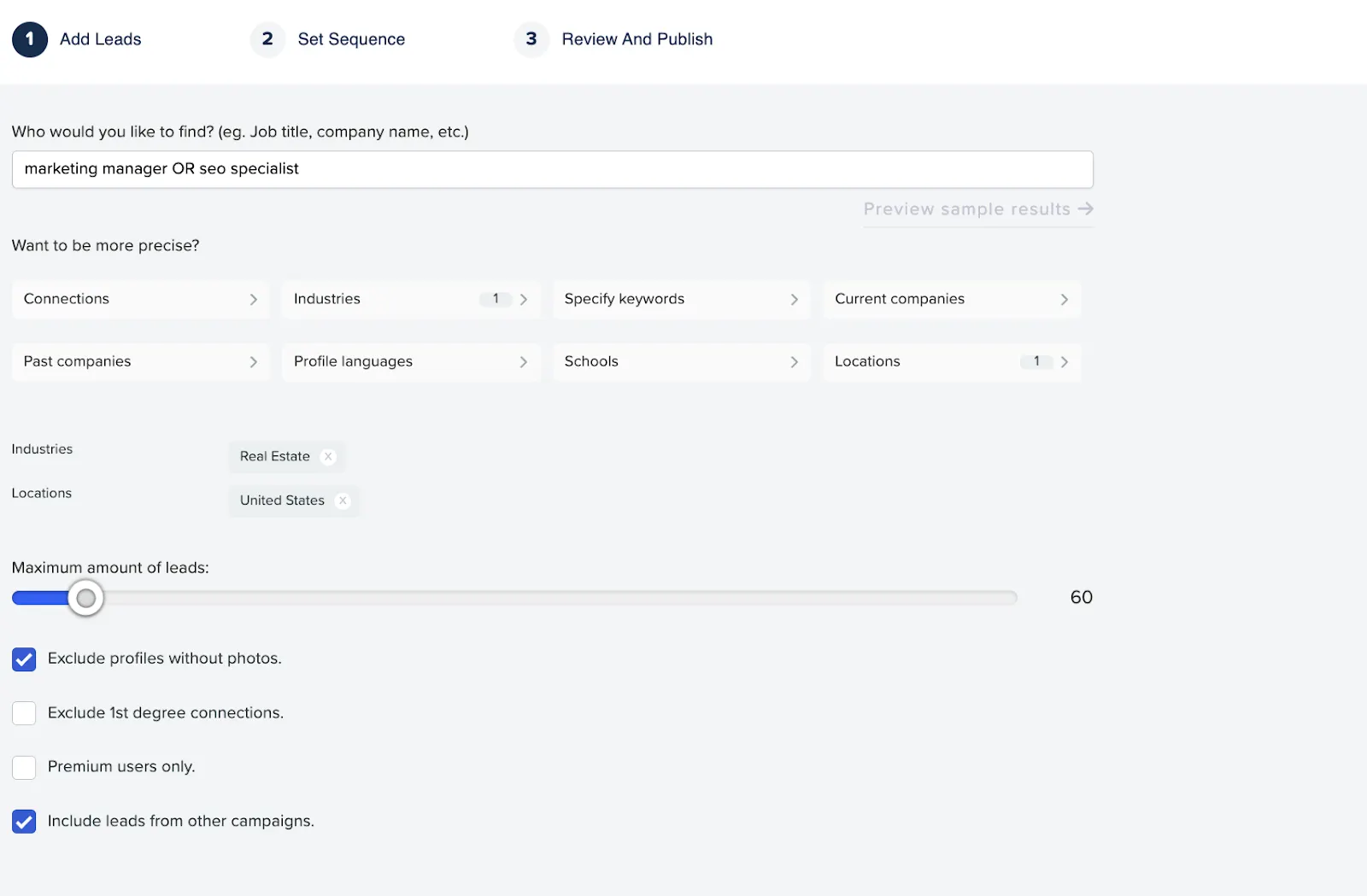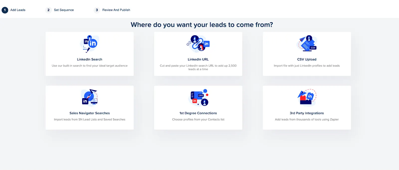 - Pull prospects from LinkedIn searches or Sales Navigator.