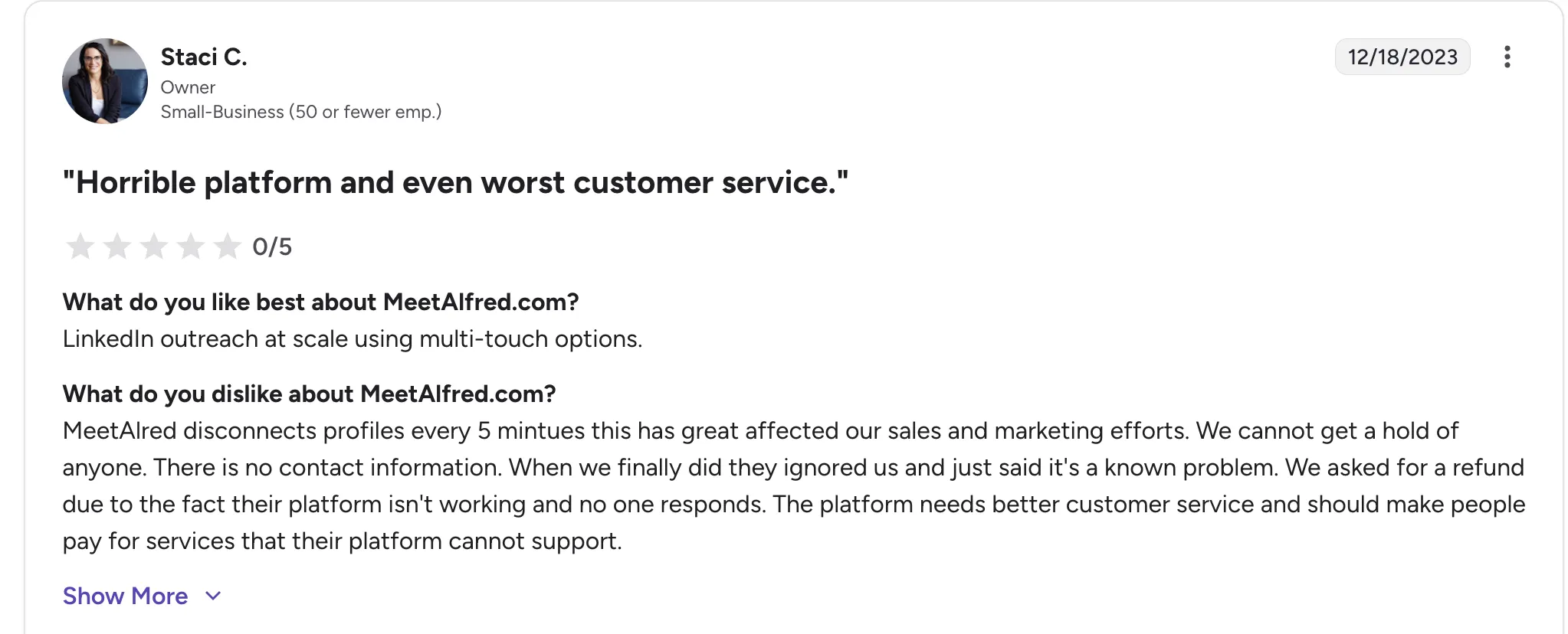 User feedback on G2 shows mixed sentiment. Many appreciate that Meet Alfred makes it easy to build multi step LinkedIn plus email workflows and manage them from one place.