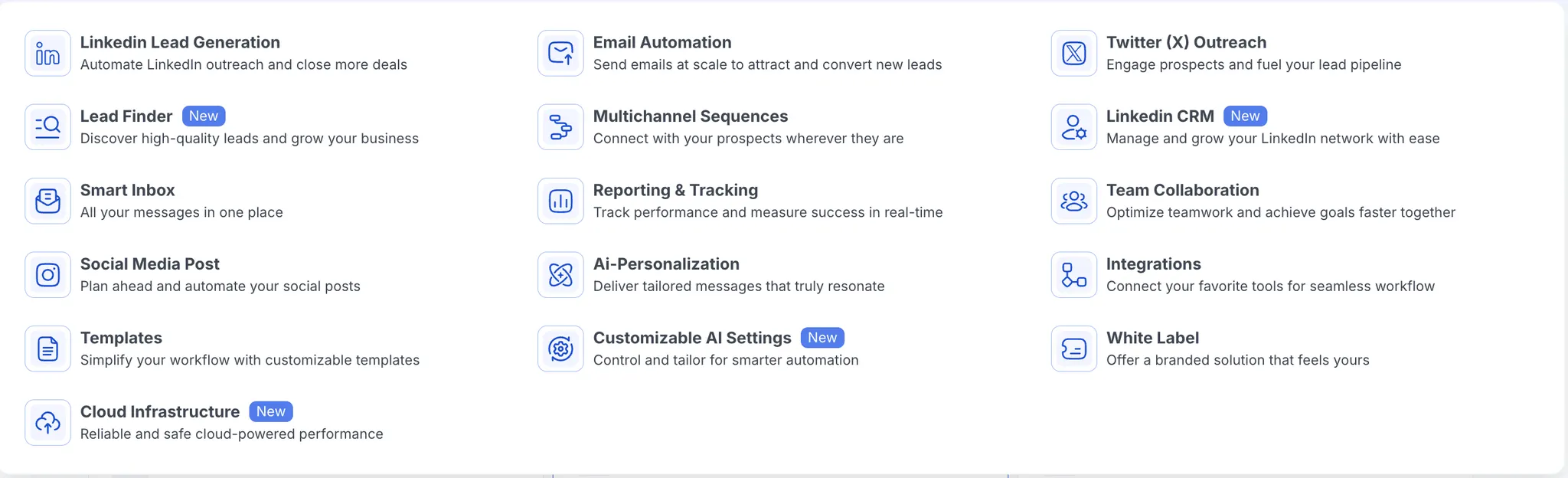 - Advanced LinkedIn CRM, InMail automation, groups and events automation, and more.